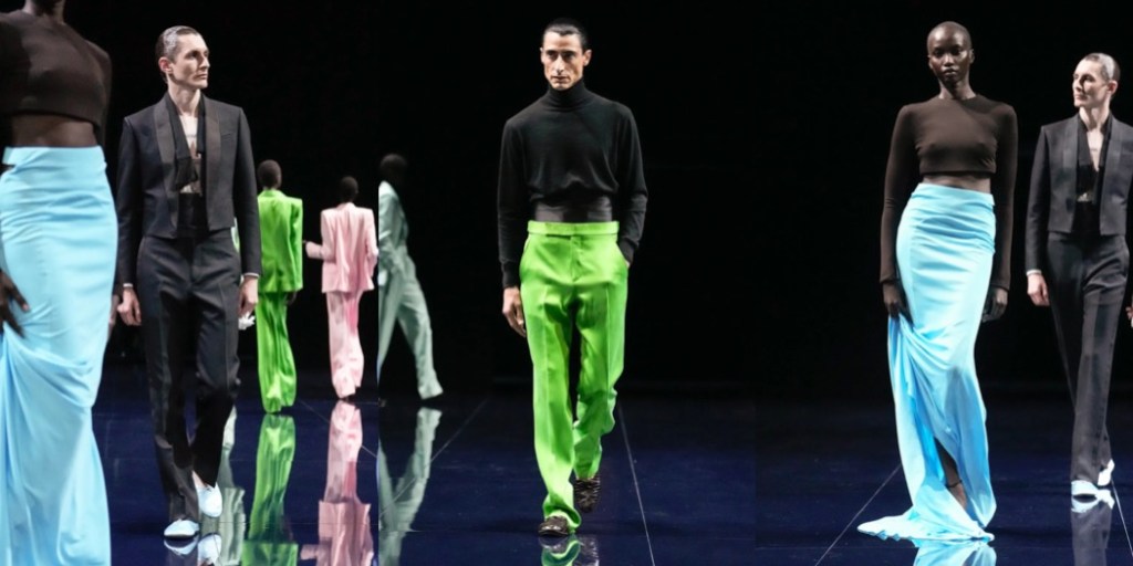 In his press notes, the designer described the “unremitting verticality” of his vision for Tom Ford’s “beautiful creatures,” a concept rendered sublimely through masterfully elongated silhouettes, punctuated by bold color accents (green! blue! pink!) and razor-sharp shoulders. The collection – now arriving in stores – also introduces Ackermann’s take on day-ready pajama suits, for both him and her, that feel almost too good to be true.