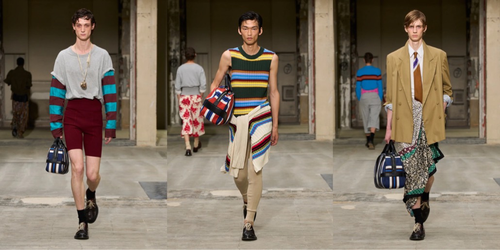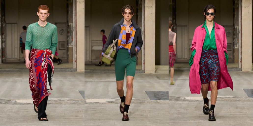 The collection blended Kronthaler’s affection for fluid silhouettes and Milano’s sartorial heritage. Tailoring was slouchy and nonchalant, but utterly chic. The coats were broad-shouldered or leopard-printed, and full of Milanese charisma. Hunky men in dresses and killer-high platforms were an exuberant view – especially when seen in a passeggiata through a San Babila café and then out on street side marble-floor arcade. A rose-embroidered tabard with a mid-calf red satin boot was a look that was both ecclesiastical in its clerical regality and campy in its unabashed queerness.