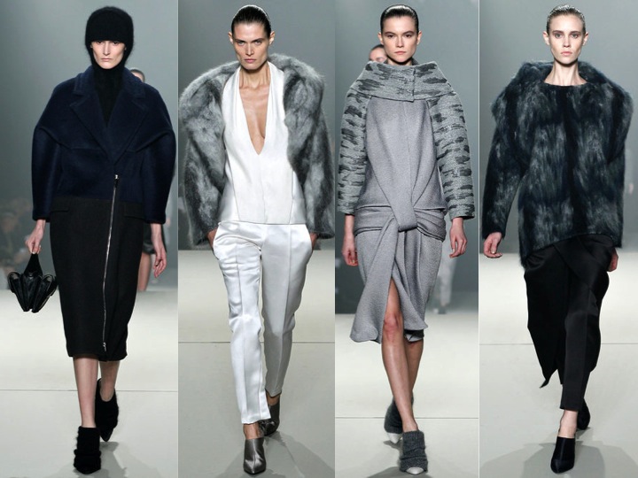 And I really loved the origami grey dress with a metallic top on it! The model that closed the show was Malgosia Bela, a Polish top model who is starring now for A.Wang summer campaign. She came out in a minimalistic white blouse and pants, and in a beautiful grey fur. Malgosia looked really stunning! The shoes of the collection were also cool- black leather pumps and on them a grey wool sock! That will for sure gonna work for cold conditions!