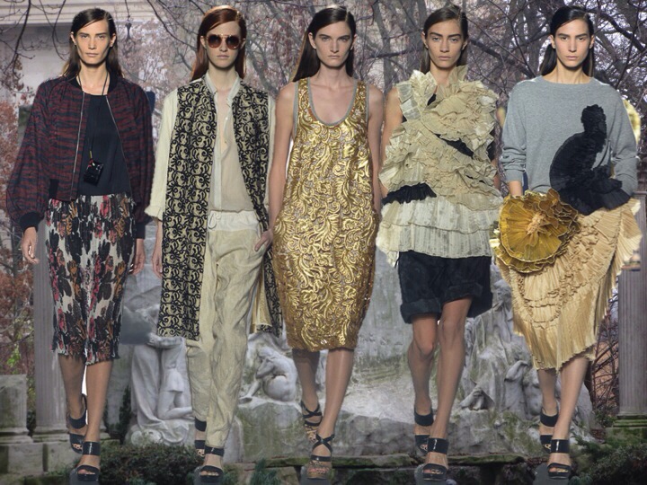 Dries Van Noten again did what he’s best at- the Saint Germain chic in his SS14 collection. After hot checked shirts and Parisian boheme inspired feather dresses, it’s the time for Parisian Belle Epoque style. Dries really did a good job. Amazing ultra big ruffles, metallic elements and flower prints look simply fantastic. Beautiful dresses with middle length, chic jackets and street influenced sweatshirts were also here. So, definitely the colour for Van Noten that ruled was metallic gold. And the closing look with Sasha Luss that was all covered with ruffles still sits in my head!