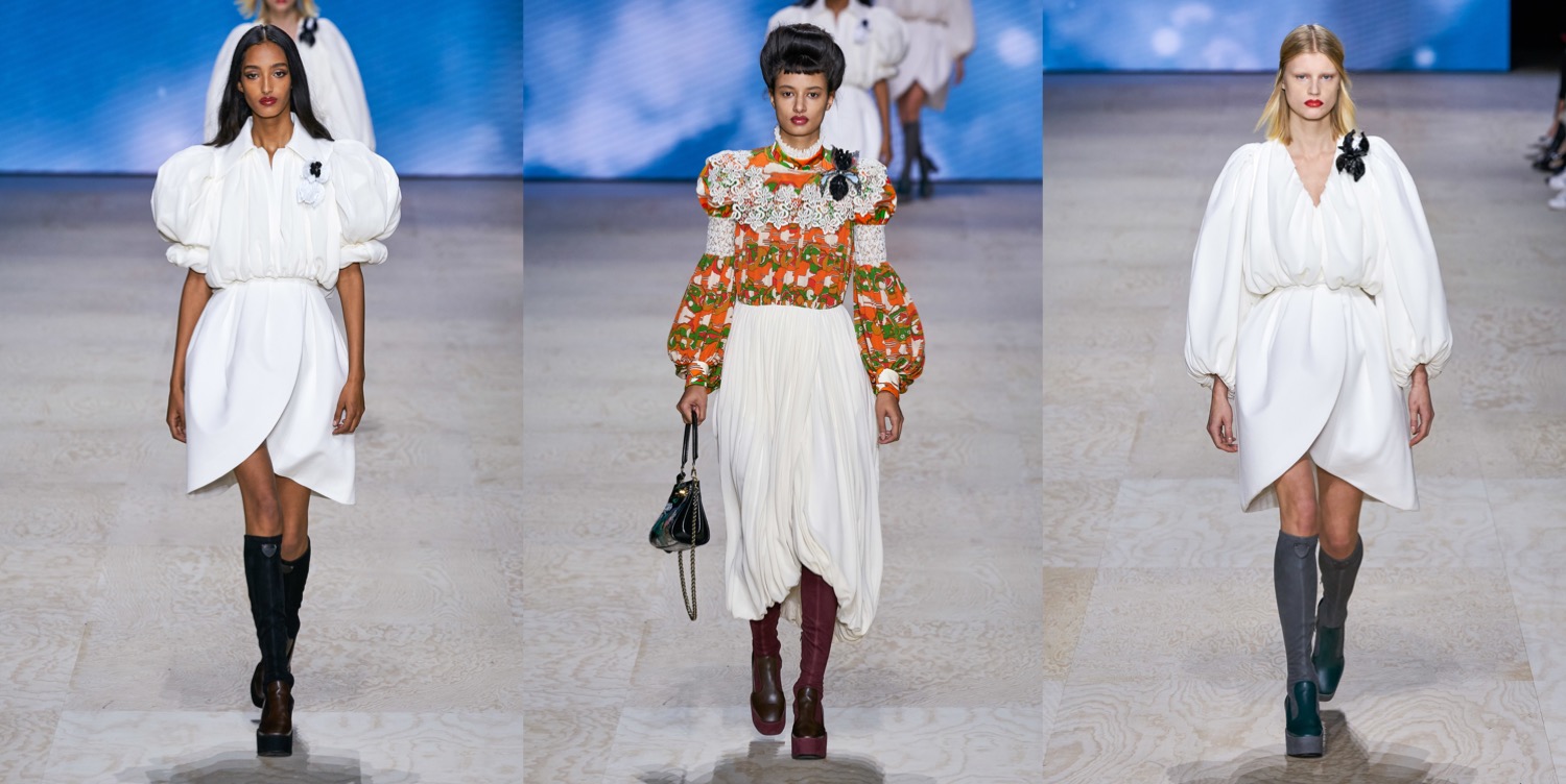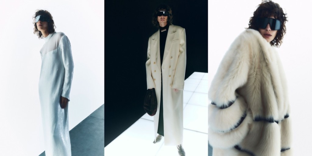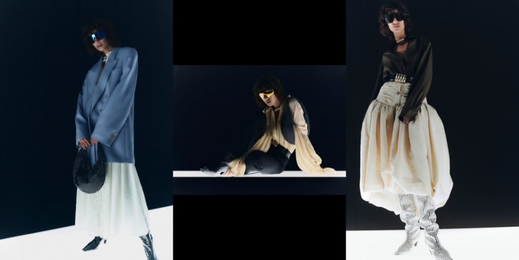 Khaite‘s resort 2023 collection, as Cate Holstein went on to explain, picks up where the “sharp, stealth New York woman” aesthetic of her autumn-winter runway left off. Let’s say there’s a whole lot of badassery happening, from the leather chokers that accent nearly every look on down to the blunt-toed boots. Leather outerwear is a foundational category at Khaite. Cropped motorcycle jackets mingle with oversized bombers, including one that opens the lookbook with heavy-duty studding at the shoulders. The tailoring, in leather and otherwise, takes its proportions from menswear. “We’re predominantly a feminine brand,” Holstein said, “but in order to bring out that femininity you have to have elements of men’s, otherwise it goes in a girly direction, which we try to steer clear from.” It’s not that there aren’t girly embellishments here. Sequins are another recurring motif, as seen on a shift dress with a mock turtleneck as easy-wearing as a t-shirt and on a slip dress that grazes the ankle. The most novel pieces however involved not surface treatments, but volume play. A yoke-waisted skirt that ballooned out to the knees and a plissé shirtdress with poet sleeves were surprise hits of sweetness amidst the collection’s stealth glamour.