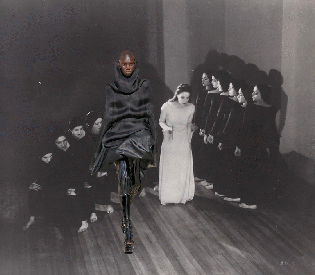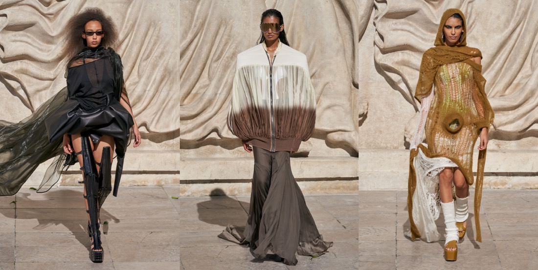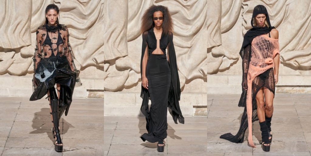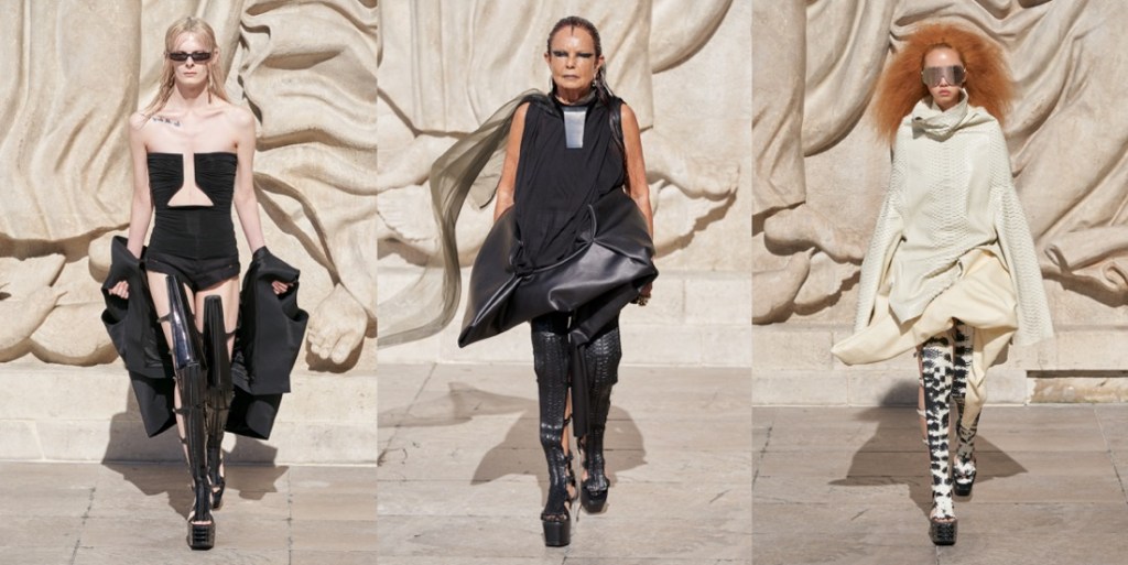 There’s something definitely intriguing about Rick Owens’ recent collection. The designer dialed down on the performative and returned back to his core, dating back to his 1998 debut, “Monsters” – his first complete collection, a pre-runway line-up that marked the birth of a new era in fashion. Not that the designer is retrospective in any way (although he take over the Palais Galliera from June with a retrospective exhibition). But you can see and sense that certain coarse, undone beauty of his long, draped jersey dresses reflected in the new season evenigwear, covered with thin laser-cut leather fringes that rippled like gills as the models moved down the runway. Rough sensuality was also embedded in the breath-taking mille feuille tops (that looked as easy to wear as a t-shirt) and the oversized, fringed leather jacket worn by Kristina Nagel (have you seen her recent shoot for i-D featuring Rick and Michele Lamy? Obsessed). On the collection’s ambiguous power-dynamic between the elusive and the bold, quiet and loud, he said: “it’s a constant, trying to keep that balance: of shock and wonder, but you can’t let people dismiss you as just being out of the question.”