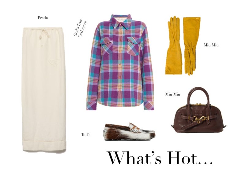 What’s Hot (14.8.24) August 14, 2024August 10, 2024 | Design & Culture by Ed God’s True Cashmere Dune Tartan Sport Shirt Prada Maxi Skirt Tod’s Pony Hair Loafers Miu Miu Leather Top-Handle Bag