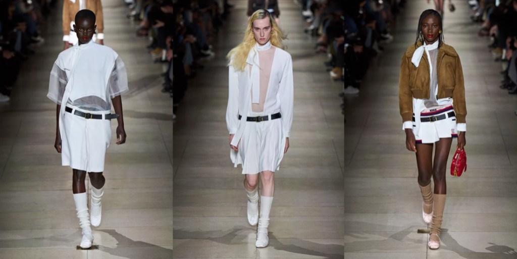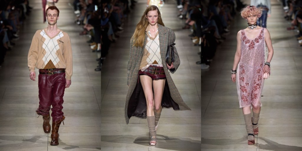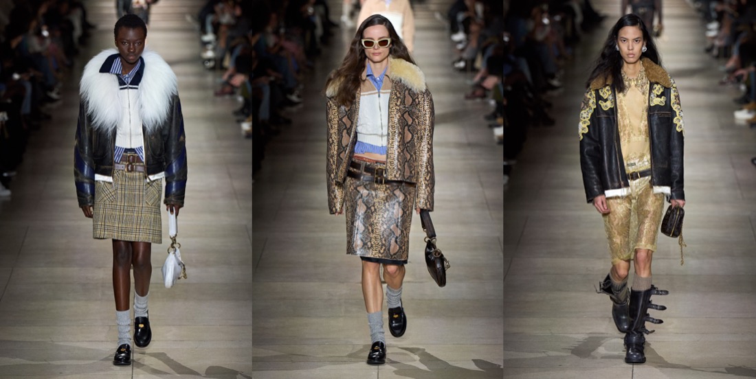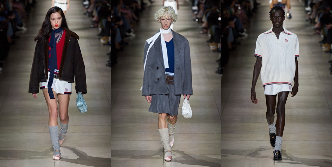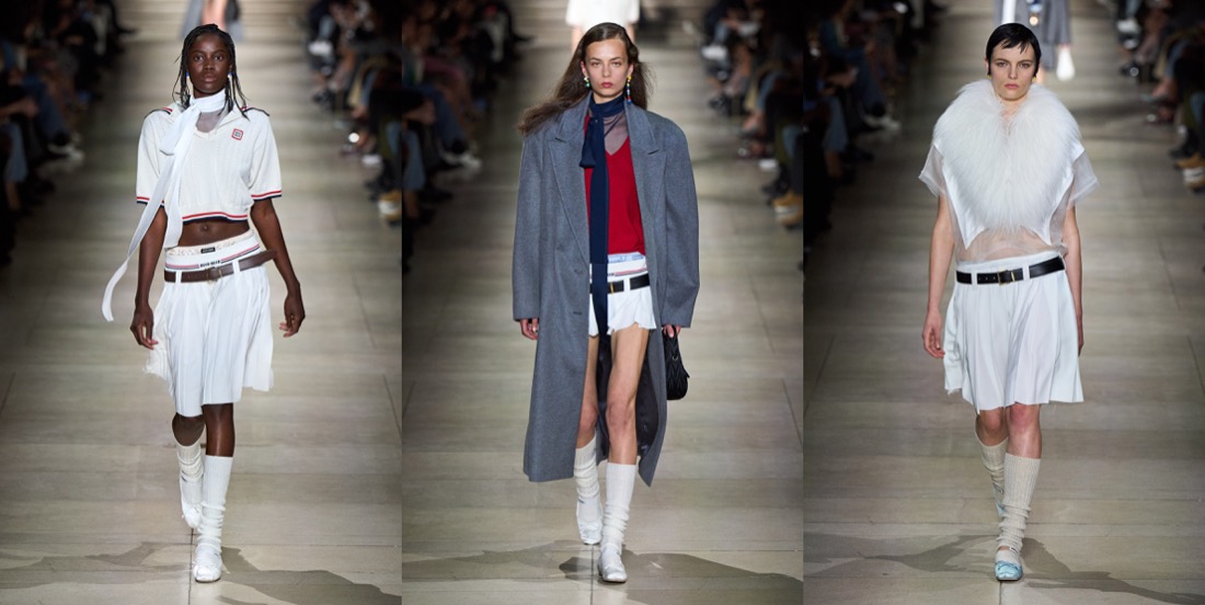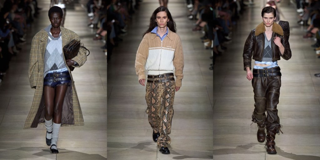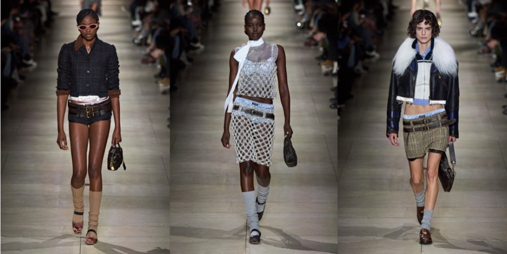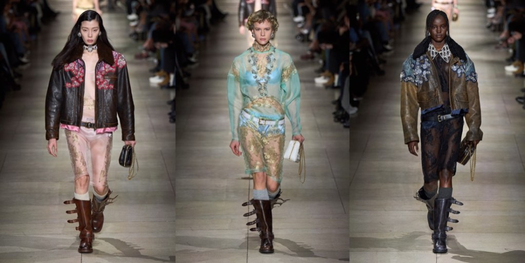 The Miu Miu girls (and boys) are on fire! It was only fitting that Miu Miu would have the final say this season – thanks to a change in the traditional schedule, the show rang out a month of collections, for which its last proposal set the tone in a big way. Other than Balenciaga, no brand has been as impactful as Miu Miu on the silhouette we’ve encountered on daily runways over the last four weeks: an oversized blazer or coat worn over a lingerie element and a mini- or evening skirt. This season, Miuccia Prada reiterated that influence in a collection that continued where the last one left off, reminding the industry who got the idea in the first place. The winter embodiment of the Miu Miu muse was less of a workaholic and more of a sports freak. After disrupting archaic office dress codes last season, she set her sights on the tennis court, giving Wimbledon officials more than they bargained for in super-short, low-riding Y2K skirts and tops with cheekily placed see-through lace panels. She didn’t care if it was winter because she’s too hot to get cold. Memories from her junior ballet phase (she outgrew it) manifested in ballerinas and knitted socks before her inner rebel really took over and things went hell for leather. As the same theme appeared in new variations – shearling, snakeskin-printed or stained leather, with faux-fur lapels – a more gender-diverse expression of the Miu Miu person took shape, demonstrating how the skimpy silhouette also works on nonbinary and traditionally masculine physiques. Along with every fashion girl and their mother this month, men have been wearing last season’s cropped Miu Miu cable knits and little jackets to the shows. This time, there was new material for them to obsess over: lace-up leather trousers, big buckle boots, and some prettily encrusted sheer crystal dresses, if there’s time for a drink after tennis. Miu Miu closed its menswear line in early 2000s, and 2022 feels like the year to revive it.