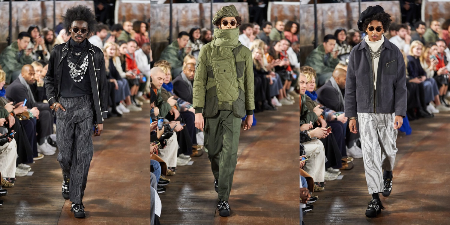 In support for the Black community, I continue celebrating and highlighting the talented individuals that shape fashion today. Take notes! Nicholas Daley’s keen sense for fashion is matched by his taste in music. After spring-summer 2020’s live jazz performance, he upped the ante for the autumn-winter 2020 line-up with a fashion show that kicked off an entire night of events at Earth, the landmark East London venue. His musician girlfriend Nabihah Iqbal came up with the title of the new collection, “The Abstract Truth,” and shared billing with U.K. dub legend Mala among other artists at the after-party. “I like my shows to be about community, it’s always a friends and family affair,” said Daley speaking backstage between sets. To warm up the crowd for the fashion portion of the evening, he enlisted a trio of young South London musicians – Rago Foot, Kwake Bass and Wu-Lu – to perform a live score. Borrowing from the world of experimental jazz and psychedelic rock, the music gave song to the wide-ranging references in the new collection, including afro-futurism and the black abstract art movement of the 1970s. He was particularly drawn to the work of Frank Bowler whose first major retrospective opened at the Tate this time last year. The Guyanese-born artist’s vibrant “pour paintings” came through most vividly in a show-stopping hooded poncho. Daley has a knack for spinning utility clothing with a sense of specialness. In place of camo, he used a handsome khaki green jacquard patterned with hand-drawn lines to elevate his fishing-style vests and Crombie coats. The designer’s commitment to supporting local craftspeople is ongoing. In addition to working with an English mill on the custom jacquard, he dug into the archives of Scottish tartan maker Loch Carron, unearthing two particularly striking mohair checks, both of which added a rich hand to slouchy button-down jackets and peg-leg pants. Those traditional British tropes were remixed with handfuls of neo-boho accessories – coin-trimmed necklaces and scarves, knitted crossbody bags and berets – and that magpie eclecticism felt fresh and contemporary. With models sporting Jimi Hendrix–inspired coifs, the groovier elements of the collection were nicely amplified. The musicians looked just as cool, dressed in all black and with Daley’s new oversize baker boy hats and genius coin-trimmed sneakers both made in partnership with Adidas.