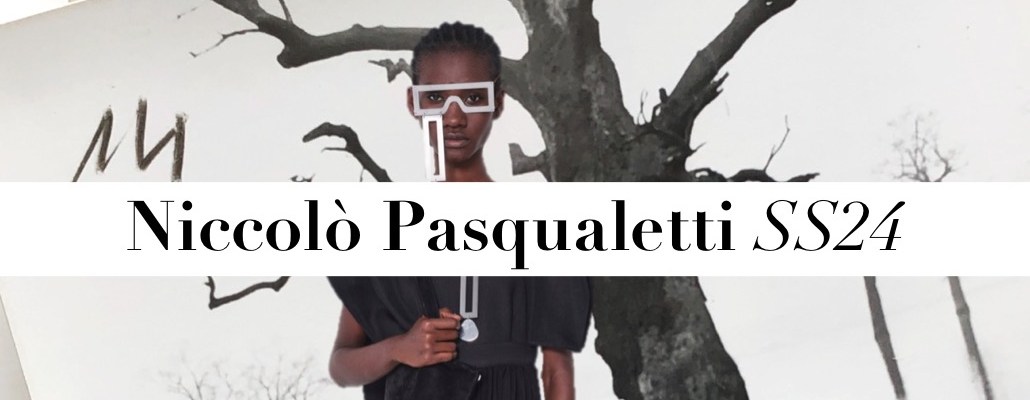 Sometimes, a small, tightly-edited collection might be worth more meanings than an entire, budget-proof fashion spectacle. “In the white space, you see things for what they are, and you forget where they came from,” says the enigmatically vivid press-note for Niccolò Pasqualetti’s spring-summer 2024 collection. The white space might refer to the white cube venue the young designer chose for his fashion show in Paris. But it might also allude to a more metaphorical, imaginary space. In such a place, one thing easily changes into another. “A simple evening dress, a classic Italian suit, caught in a moment of transmutation, evaporates into a cloud. Each detail, the buttons, the zippers, the stitching are disturbed by this process. Yet still some recognizable pieces pierce through the fog, only slightly obfuscated by it.” Garment distortions are Pasqualetti’s key signatures; drawstrings, secreted in garments, are able to totally transform the silhouette. Take the free-flowing cape that cinches itself to form a column. Like protective clothing, when pulled tightly, it forms a seal with the body. These fastenings reappear, in the shoes, and in the hoods which hide within the collars of jackets. In Pasqualetti’s poetic world, there is no night and day, as everything happens at the same time. Pockets multiply across the collection giving each look a newly practical dimension regardless of the occasion. Then, laid on top of everything, silver jewellery that resembles out-of-this-world, spiritual amulets. Yes, that might the right word to describe this collection: spiritual.