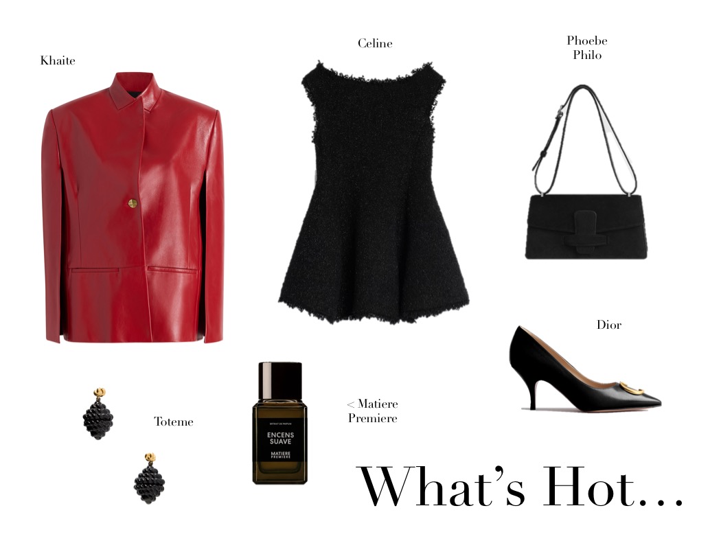 What’s Hot (7.11.25) November 7, 2025November 3, 2025 | Design & Culture by Ed GET THE LOOK: TOTEME Cutout Patent-leather Pumps KHAITE Kye Calf Hair Clutch Nour Hammour Amara Shearling Jacket Prada Napa Leather Mini Skirt Irene Neuwirth Bow 18-karat White Gold, Pearl And Diamond Earrings