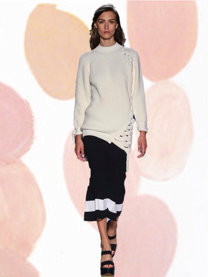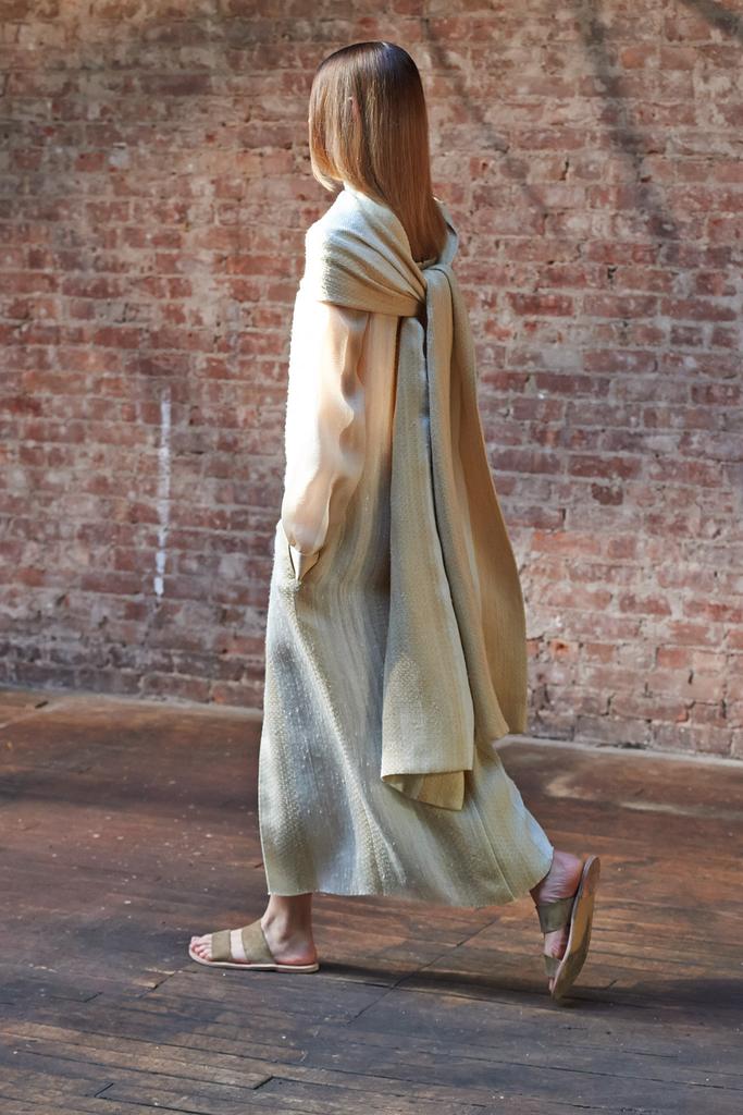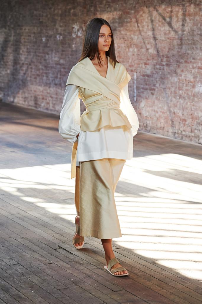 The Row by the Olsen sisters is usually my favourite. But this time, it’s even more than favourite. It’s holy. Presented in a silent, brick loft with wooden floors in SoHO, the models started to emerge in a slow, calm way. Pouring through skylights, the morning sun glinted off the gold basket weave of a loosely tied coat, and shimmered on an organza top that looked as if it might’ve been dipped in tea or sepia-dyed. These were angels? Close. The clothes made from raw silk, crisp cotton, woven tabard finished with fringe… not many New York labels concentrate so much on detailing.