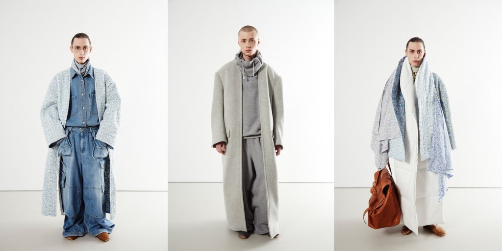 Hed Mayner’s autumn-winter 2022 collection exists in the space “between despair and ultimate hope“. The Israeli designer explained further: “But I am thinking about the space between you and the garment, layered and protected…you are in a bubble.” Mayner speaks like a poet and he designs like one too, operating instinctively and emotionally, more interested with how a garment will feel on the skin, move about the body, and imprint on a life than how cool it looks or how hype-y it is. It’s this humanity that has garnered Mayner fans across the world, some in fashion and some far outside it, who plug in to the gentle ideas he pushes each season. For the new season, the sloped shoulder is the big story. “It’s not just about a refined jacket,” he said, “it’s about injecting an energy, a vibe.” The vibe here is one of movement – clothes are moving, dripping down off shoulders, pooling around the ankles, or cinching up at the waist, tucking in under heels and into flat buckled shoes. Quilted faux-leather scarves and squares of Liberty fabric are hung around necks or clipped onto lapels and belt loops. In a season of statement outerwear and bold coats, Mayner’s offering will leave a big mark; double-breasted wool styles and clever Macintoshes promise artful protection against the elements. A first foray into prints, done with Liberty fabrics, is a counter to the almost-businessman spirit of his wide blazers. In sensitive pastels, the quilted pants and filmy button-downs look like something “maybe from your grandmother, or something American, even though it’s a British company.” Mayner’s clothing evades provenance like this: based between Tel Aviv and Paris, thinking in a way that’s not really of a place. But it’s certainly of our time. His clothing offers a gentle reprieve from stress and worry. Wouldn’t it be nice, lovely, refreshing to settle into to a Mayner puff of jacket?