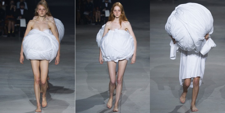 Imitation Of Christ‘s Tara Subkoff created the term “up cycling” in 2000. 23 years later, it is a prevalent – and relevant – phenomenon in the fashion industry. The designer is more than fine with this; she wants others to “imitate” that sustainability-forward practice. With fashion’s ever-returning obsession with grunge and the 90’s, Imitation Of Christ’s spring-summer 2024 collection – which opened this Los Angeles Fashion Week with a dance performance including a blessing in every major world religion – convinces with gorgeous slip-dresses, DIY details and gender-blurring silhouettes. The hand-painted dove on billow-y gowns and utilitarian boiler suits is a fitting call for global peace. The symbol circles back to the spiritual side of Subkoff’s fashion performance, where the harmony of prayers and pujas created a peaceful celebration of all religions practiced alongside one another with respect and tolerance. One of the white dresses bore a quote from Ralph Waldo Emerson that read “Peace cannot be achieved through violence, it can only be attained through understanding”. As simple as that yet so hard to comprehend for the politics of this world.