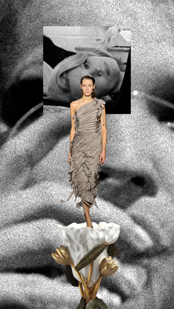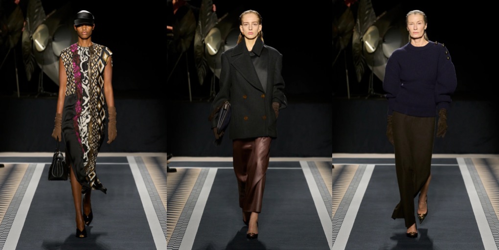 Alongside creative meditations on Mariano Fortuny’s pleats and Murano glass beads, Copping also introduced striking double-flared silhouettes, ornamented capelets, and tweed tailoring featuring a skirt pinched with a brooch. One velvet column gown in ink black is dramatically gathered by a modernist, brooch-like embellishment. This one felt absolutely Parisian, “chic ultime“.