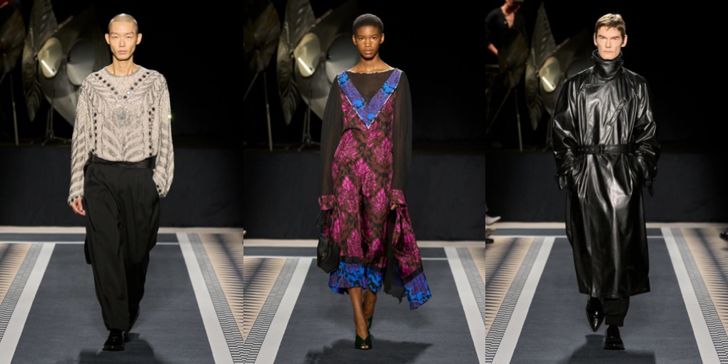 Alongside creative meditations on Mariano Fortuny’s pleats and Murano glass beads, Copping also introduced striking double-flared silhouettes, ornamented capelets, and tweed tailoring featuring a skirt pinched with a brooch. One velvet column gown in ink black is dramatically gathered by a modernist, brooch-like embellishment. This one felt absolutely Parisian, “chic ultime“.