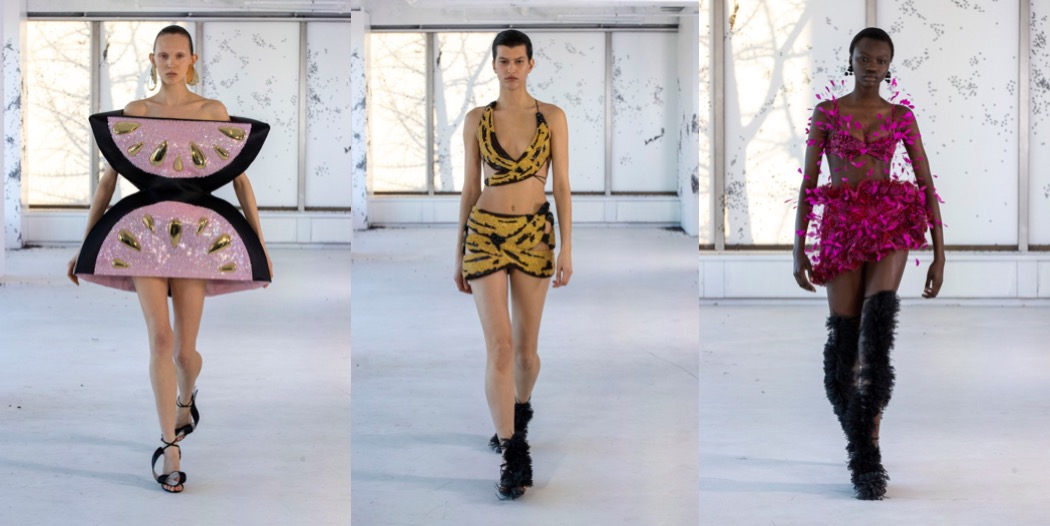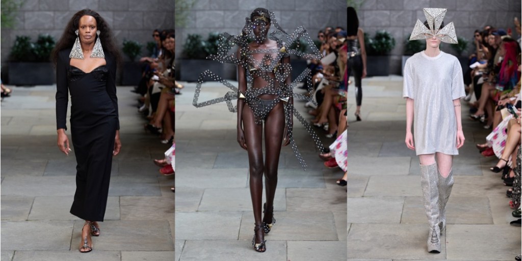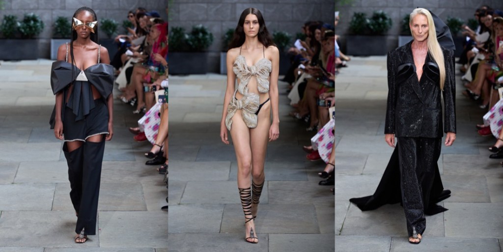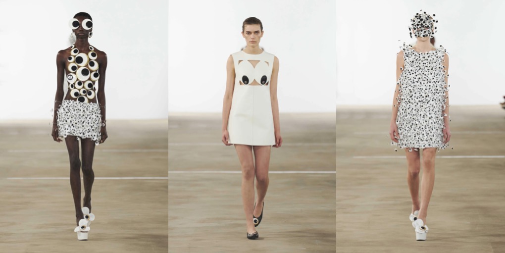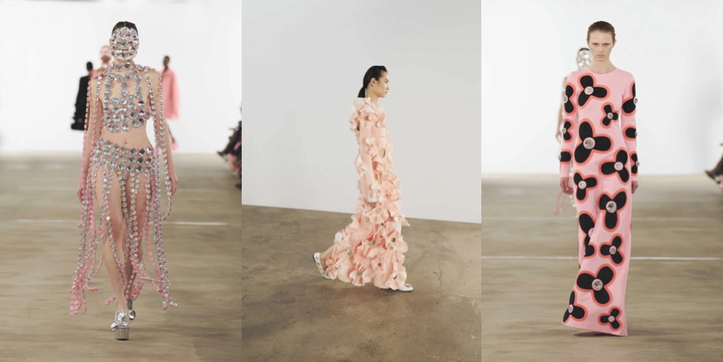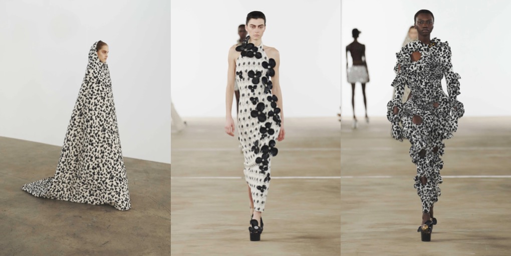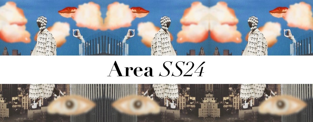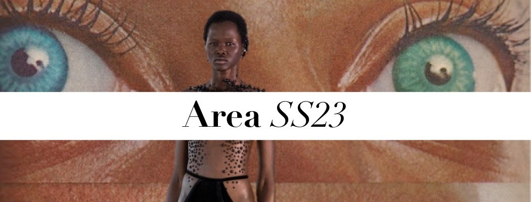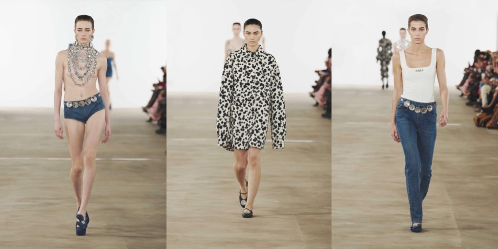 Area‘s Piotrek Panszczyk is a maximalist; when he loves a theme, he goes all the way with it. This see-now-buy-now collection’ the starting point was eyes, which led to cartoon eyes, which led to the simplified shape of a circle inside another circle. “The eyes as a symbol just always speak to us because they connect so many of our favorite art forms like Pop Art in the ’60s or surrealism in the 1920s; from Warhol to Man Ray,” the designer said. The show opened with a simple mini shift dress in white leather with circular leather appliqués at the chest in the shape of eyes. Eye shapes were also cut out from pink leather to create an oversized coat and matching mini skirt in carnation pink, and another in white, which he paired with a high waist slim maxi skirt. Denim is a big category for Area and every season there is a new novel approach to the fabric. This season, he created a Dalmatian jacquard denim that was truly fantastic. The spring-summer 2024 collection has it all: for editorial, a very Balenciaga-esque long veiled-cape dress. And for those who fall in love with that piece, a pair of hot pants, an oversize shirtdress, a corset top, and of course, wide-leg jeans. Panszczyk can also create impact through minimalism. At the end of the show, the concept had been stripped back to its essence: a gold metallic ring with a crystal floating in the middle, floating in a sea of black cotton. It appeared at the center of a simple oversize cotton shirt, at the halter neck of an easy jumpsuit, and also on the breasts of a slim strapless shift.