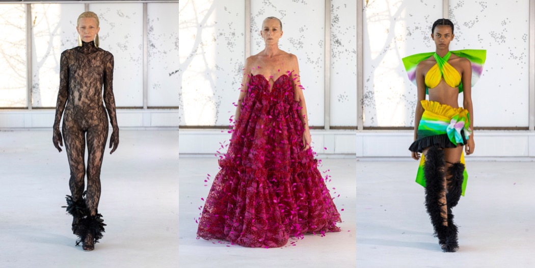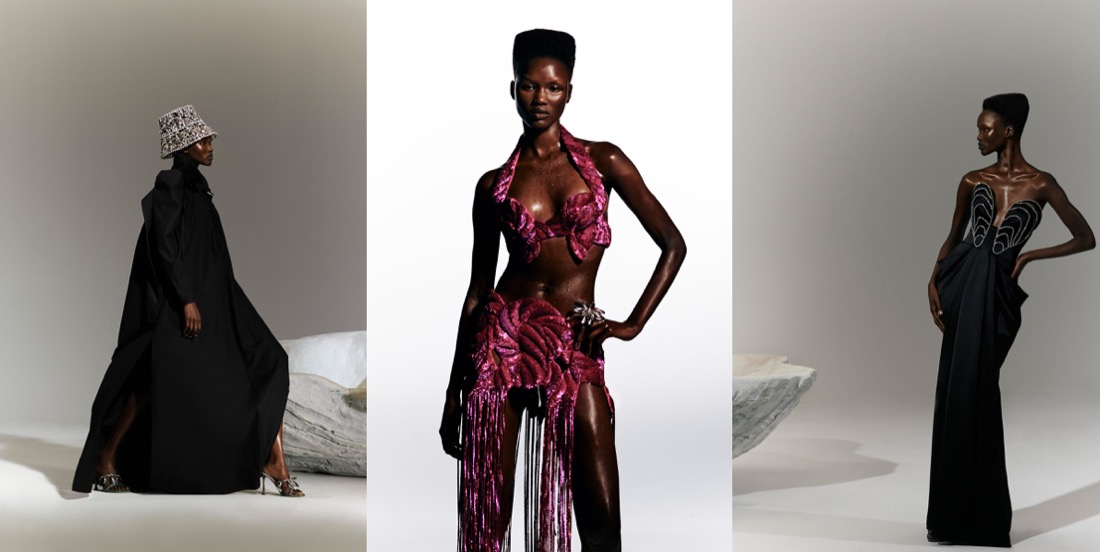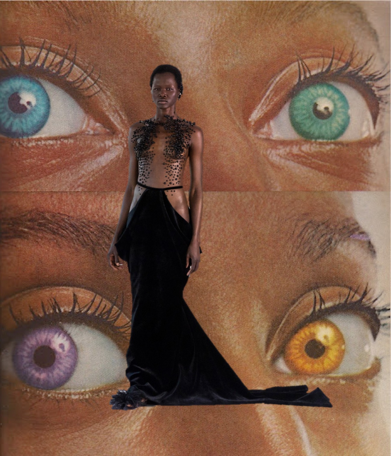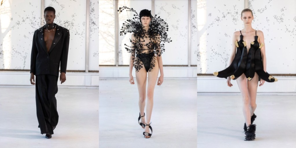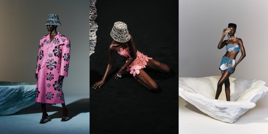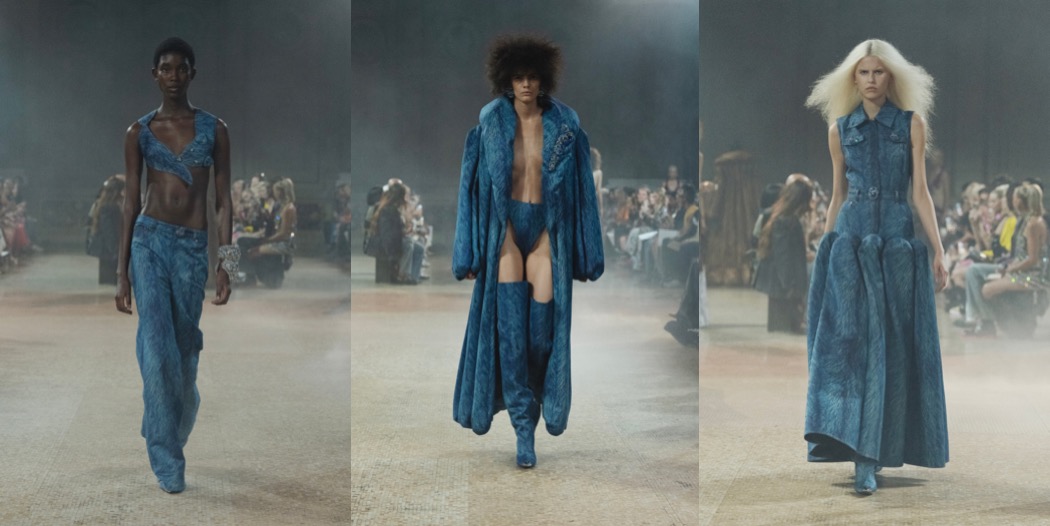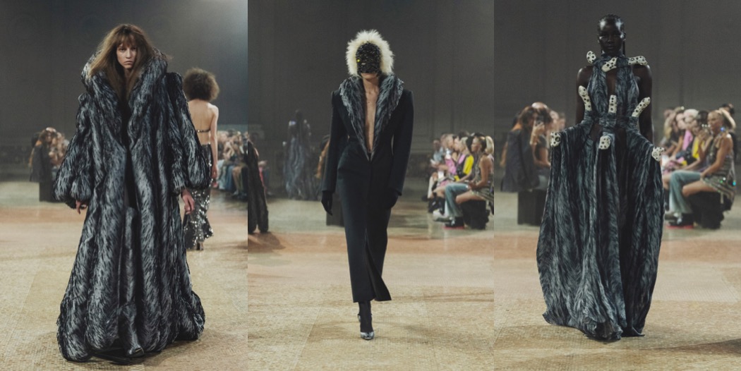 Area‘s Piotrek Panszczyk is a maximalist; when he loves a theme, he goes all the way with it. This see-now-buy-now collection’ the starting point was eyes, which led to cartoon eyes, which led to the simplified shape of a circle inside another circle. “The eyes as a symbol just always speak to us because they connect so many of our favorite art forms like Pop Art in the ’60s or surrealism in the 1920s; from Warhol to Man Ray,” the designer said. The show opened with a simple mini shift dress in white leather with circular leather appliqués at the chest in the shape of eyes. Eye shapes were also cut out from pink leather to create an oversized coat and matching mini skirt in carnation pink, and another in white, which he paired with a high waist slim maxi skirt. Denim is a big category for Area and every season there is a new novel approach to the fabric. This season, he created a Dalmatian jacquard denim that was truly fantastic. The spring-summer 2024 collection has it all: for editorial, a very Balenciaga-esque long veiled-cape dress. And for those who fall in love with that piece, a pair of hot pants, an oversize shirtdress, a corset top, and of course, wide-leg jeans. Panszczyk can also create impact through minimalism. At the end of the show, the concept had been stripped back to its essence: a gold metallic ring with a crystal floating in the middle, floating in a sea of black cotton. It appeared at the center of a simple oversize cotton shirt, at the halter neck of an easy jumpsuit, and also on the breasts of a slim strapless shift.