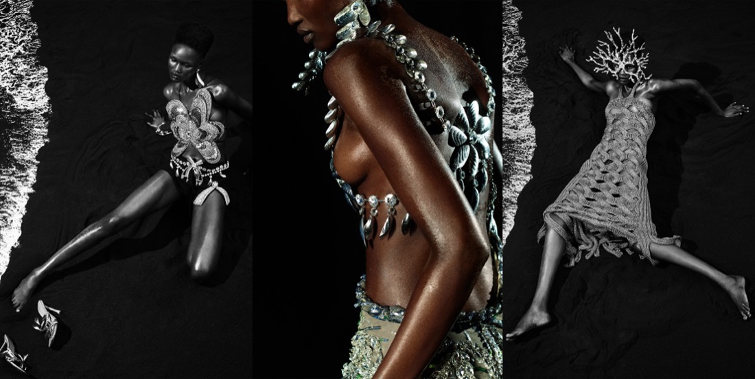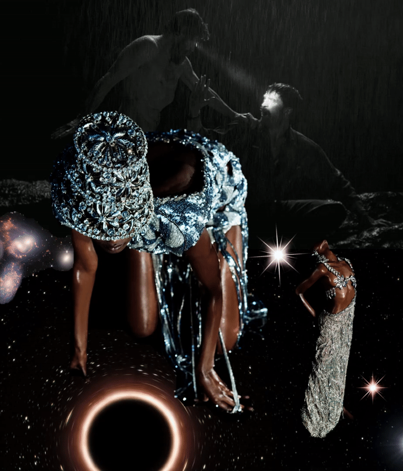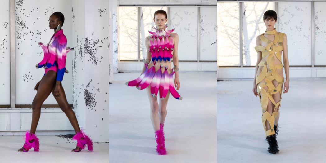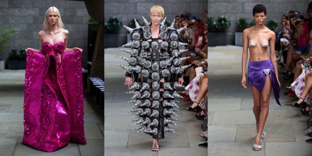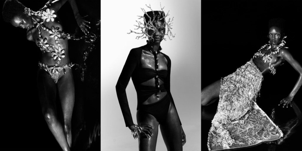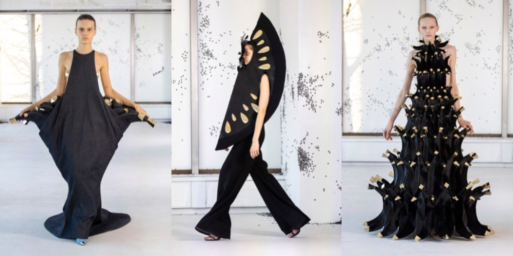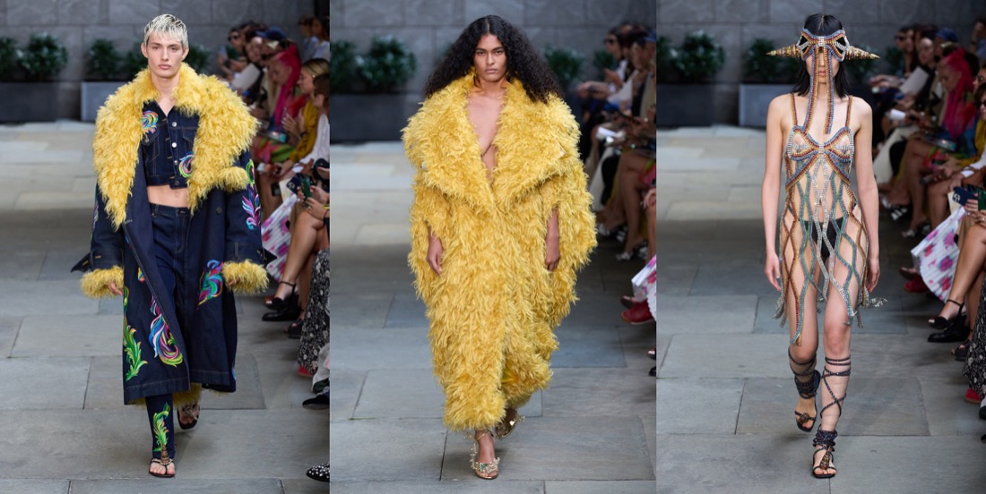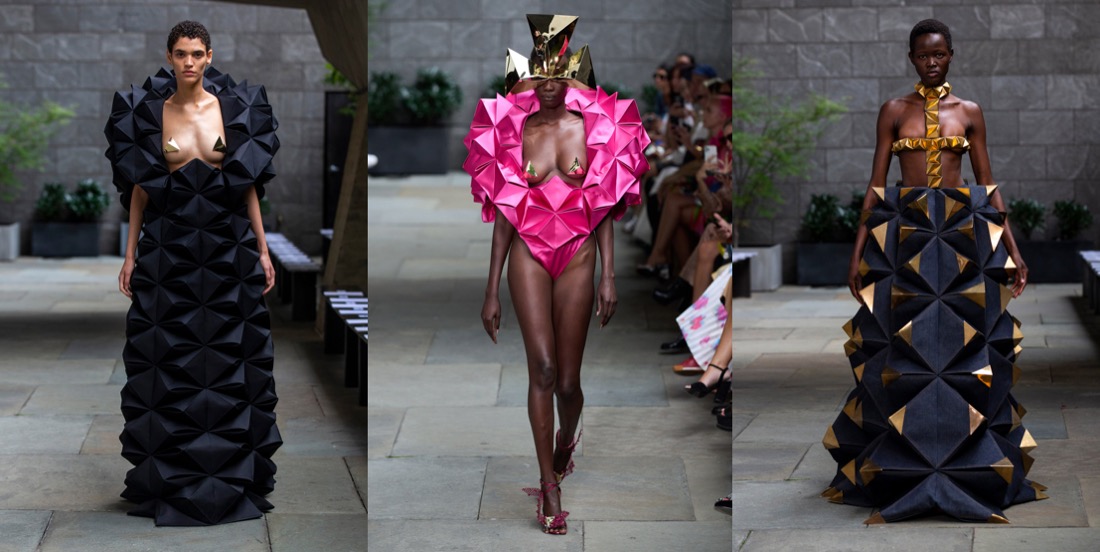 Area‘s Piotrek Panszczyk is a maximalist; when he loves a theme, he goes all the way with it. This see-now-buy-now collection’ the starting point was eyes, which led to cartoon eyes, which led to the simplified shape of a circle inside another circle. “The eyes as a symbol just always speak to us because they connect so many of our favorite art forms like Pop Art in the ’60s or surrealism in the 1920s; from Warhol to Man Ray,” the designer said. The show opened with a simple mini shift dress in white leather with circular leather appliqués at the chest in the shape of eyes. Eye shapes were also cut out from pink leather to create an oversized coat and matching mini skirt in carnation pink, and another in white, which he paired with a high waist slim maxi skirt. Denim is a big category for Area and every season there is a new novel approach to the fabric. This season, he created a Dalmatian jacquard denim that was truly fantastic. The spring-summer 2024 collection has it all: for editorial, a very Balenciaga-esque long veiled-cape dress. And for those who fall in love with that piece, a pair of hot pants, an oversize shirtdress, a corset top, and of course, wide-leg jeans. Panszczyk can also create impact through minimalism. At the end of the show, the concept had been stripped back to its essence: a gold metallic ring with a crystal floating in the middle, floating in a sea of black cotton. It appeared at the center of a simple oversize cotton shirt, at the halter neck of an easy jumpsuit, and also on the breasts of a slim strapless shift.