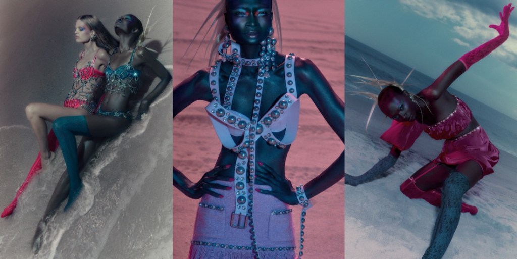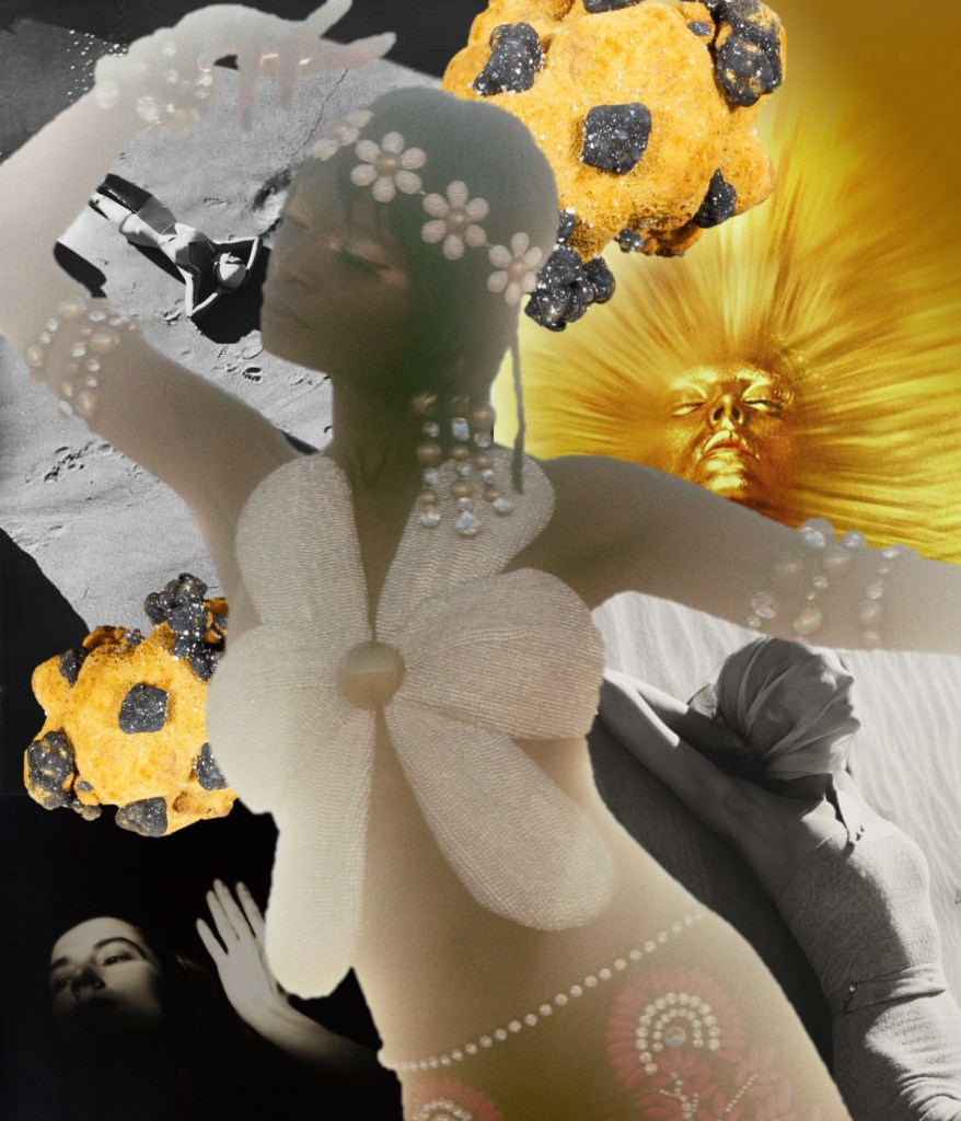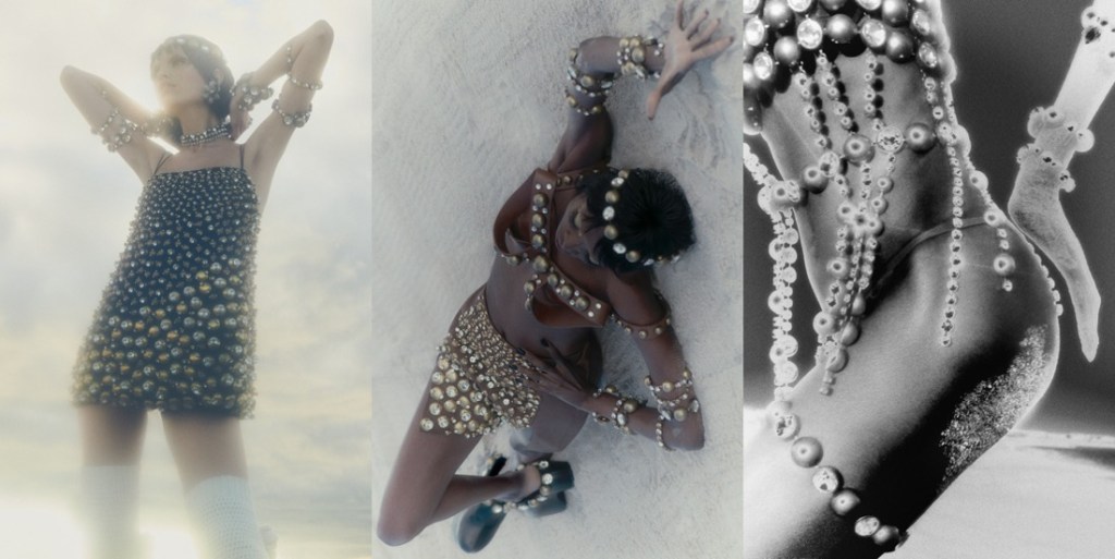 The eternal flora and fauna theme were Piotrek Panszczyk’s most obvious starting point for pre-fall 2022, taking hot pink duchesse satin and creating static floral poufs that could be sized up or down to create a crop top and mini skirt or an entrancing dress. Flowers also appear as spiked crystal tops and pasties, as sunglasses, as earrings, and as crystal pants that wind up the legs. Since Area’s last collection, its showgirl potential has become more fully realized; these experiments in fluttering crystal seem destined for Beyoncé, Olivia Rodrigo, Precious Lee, or any of the other larger-than-life women that swear by the brand’s devilishly saccharine clothes. Careful to not give it all away in a pre-collection, Panszczyk has balanced it out with sharpened tailoring in black, white, and brown houndstooth boasting crystal trim, as well as an extended section of leopard print pouf skirts and teensy bustiers. The disparate harmony of a blazers-to-pasties collection is justified by the Area books. According to Panszczyk and Area’s co-founder Beckett Fogg, the customer wants a crystal-strewn tee as much as she wants a Vegas-worthy headpiece. For seasons, Area has been reckoning with these two poles, daily use versus drama, but it seems the brand is on its way to a single more unified vision of something “dainty, natural, sultry, and thorny.” Per Panszczyk, “sexiness is just a byproduct of wearing Area.”