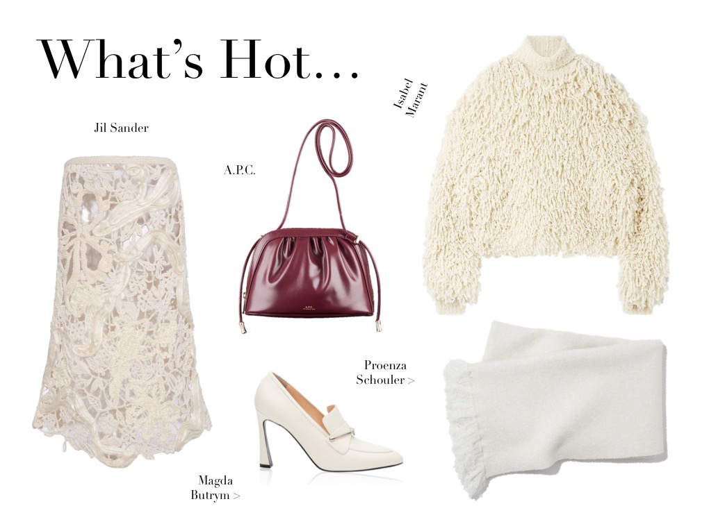What’s Hot (18.10.24) October 18, 2024October 12, 2024 | Design & Culture by Ed A. P.C. Ninon Mini Bag Isabel Marant Moka Fringed Wool-blend Bouclé Tutleneck Sweater Magda Butrym Appliquéd Leather Pumps Proenza Schouler Fringed Knitted Scarf
