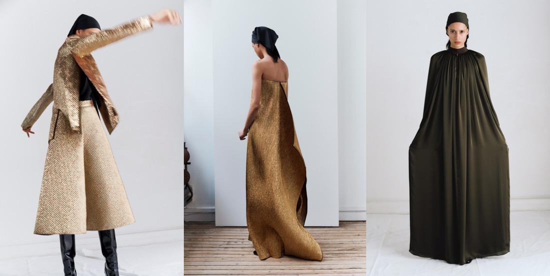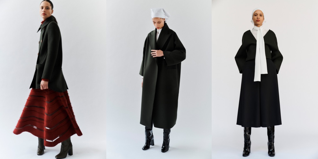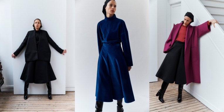 There’s always something spiritual, even sacred about Maison Rabih Kayrouz’s collections – it’s all about those poetic volumes, architectural lines and richness of textures. Coming off a collection that was informed by the romance of reemergence, Rabih Kayrouz was interested in sharp cuts and “cleaned up” silhouettes for this season. “When I draw,” he said, “I usually draw in different layers, but what’s essential are the lines. I like this purity.” Kayrouz achieved his sharp lines in a number of ways – materials played a key role, followed closely by manner of construction. He worked with both vinyl and a thick jersey for his new tailoring. Adding seams at the front and back of the body of jackets and on the sleeves gave them a graphic, architectural shape. They’ll cut a striking figure without dating as quickly as many of the eccentric suits we’ve seen on recent runways. A pair of long strapless dresses that look destined for the Oscars red carpet had sculptural proportions too. The basque-like curves at their hips are the result of pattern-making, Kayrouz said, not padding. Even grander were a pair of gowns whose volumes were achieved by stitching individual rings of different lengths of cord between two layers of tulle. Other dresses reproduced those couture-like shapes, but rendered as they were in a techy water repellent taffeta, with ripcord detailing or the elasticized hems of athletic wear, they leaned more towards a relaxed aesthetic – not sharp, per se, but easy-wearing in a way that met Kayrouz’s “cleaned up” criteria. A third evening look in a deep shade of chocolate combined the sleekness of a jersey column with ballooning taffeta sleeves.