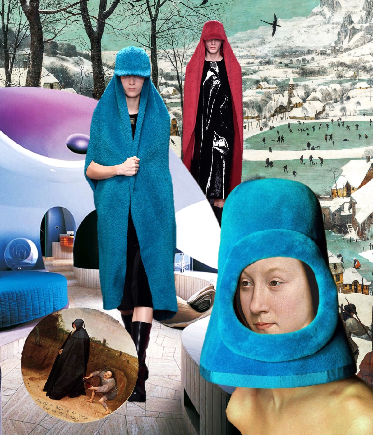 Maybe the purpose of being a silent designer is to leave the questions unanswered. To provoke, not explain. Back to the painting. Art historical interpretations of the work cast the people in the town’s square as fools, acting out proverbs of the era like “banging one’s head against a brick wall,” or “the world is turned upside down.” What does that central figure in the blue cloak depict, the one whose very cloak opens this collection? A man who has been cheated on by his wife. What can we extrapolate from that? How could Simons relate? For a designer who rarely speaks publicly, he manages, always, to say a lot about himself, his life, his obsession in his work.