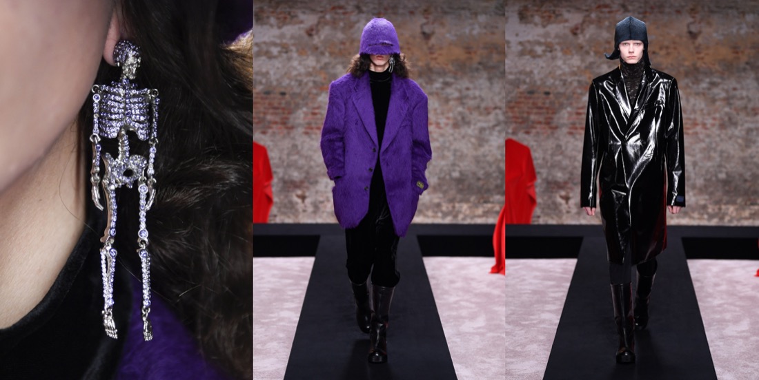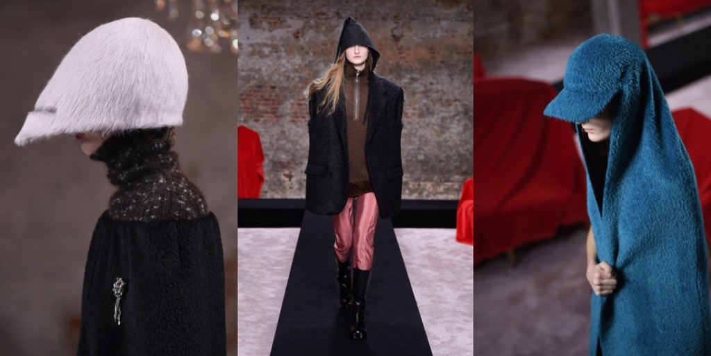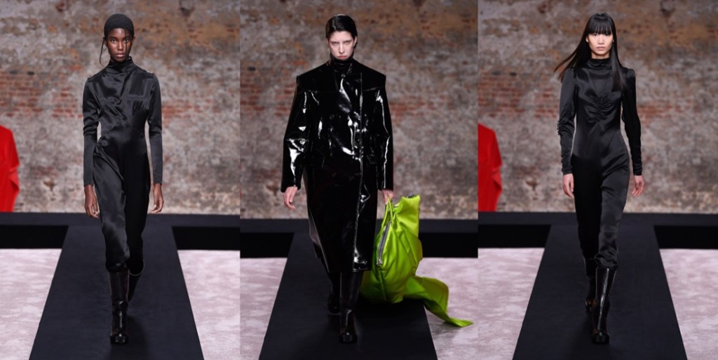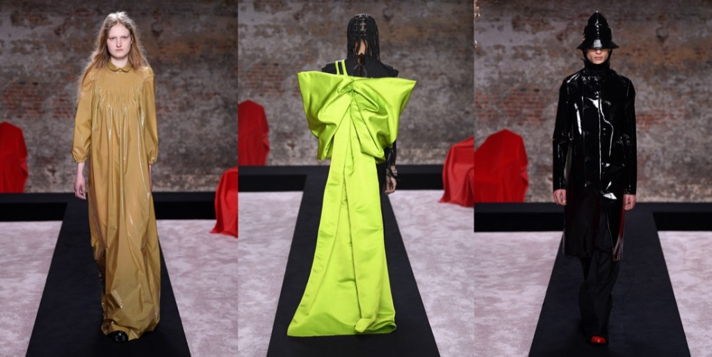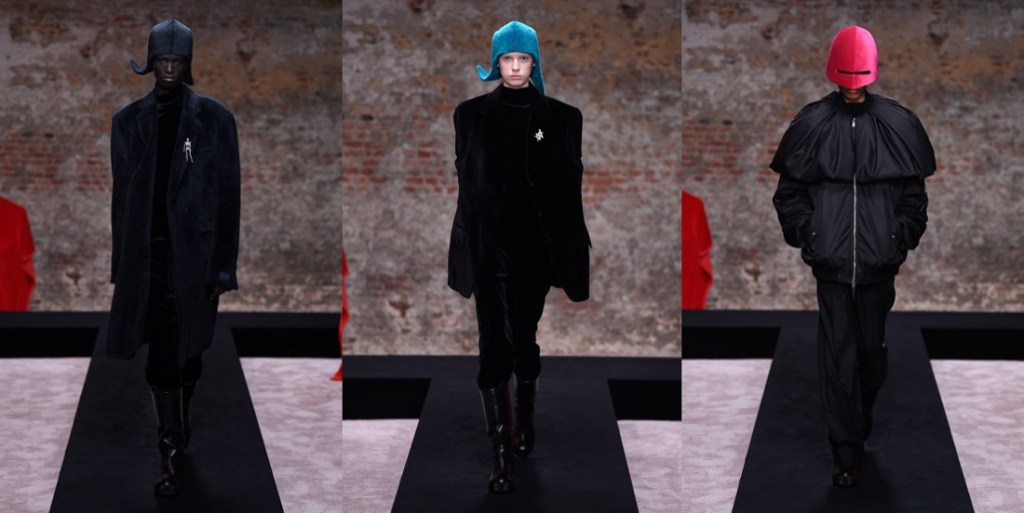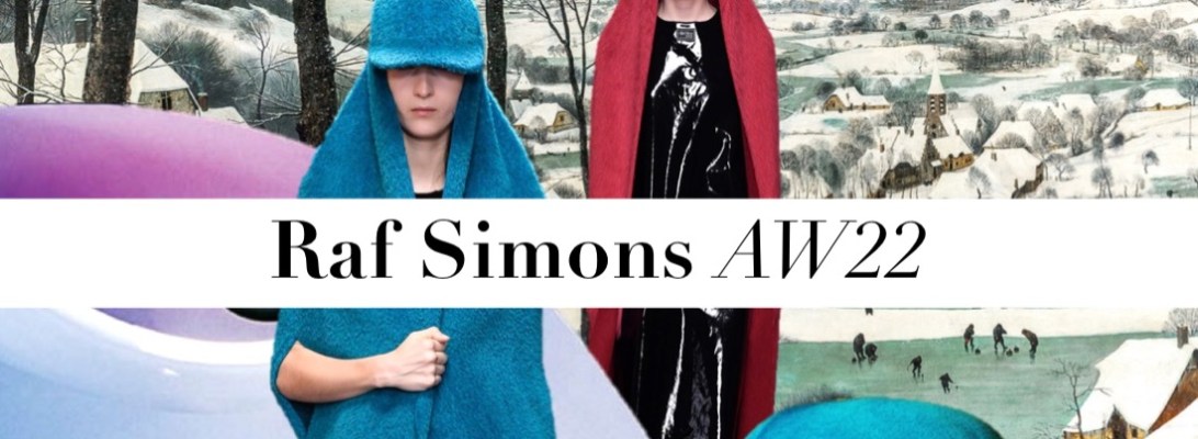 Picture this: Pieter Bruegel the Elder, Pierre Cardin and “Matrix“, all on one spooky, audience-less runway. Only Raf Simons could pull that off. After pandemic collections that furthered his explorations of youth and distress (and sometimes youth in distress), for autumn-winter 2022, the tense, urgent shapes of his rioters and revolutionaries has dissipated into a silhouette that is abjectly elegant, with draped pleated trousers, slender cloak wraps, black blouson bomber jackets, and backpacks with silken trains. Set in a stately interior, with glass chandeliers and furniture draped in red fabric, the collection’s video looks like a scene from a brooding horror movie that would would chill you to the bone. That’s how Simons works: say nothing and project it all through the clothing and the environment. This season he gave but one hint about his collection: Pieter Bruegel the Elder’s 1559 painting “Netherlandish Proverbs“. The opening look, a blue cloak suspended from a hat designed in partnership with Stephen Jones, is almost a one-to-one remake of the garb worn by the painting’s central figure. From here, the hood-hats continue in luxurious colors, emphasizing the thinness of Simons’s silhouette. Surprisingly, the headwear, seen through a contemporary lense, makes you think of Cardin’s futurist ideas dating back to the 1960s. And now, here’s where things get even more eerie: prairie dresses made from what appears to be latex, worn with cloaks and long leather neckties (very Trinity). There is something undeniably kinky about the combination; fabrics and ideas taken from the bondage shop and stripped of their obvious hotness. Simons is best when he is in a clash, taking the obvious and making it strange, turning the serene into something suspicious, or electrifying peaceful shapes with a rebellious edge. These combinations are the oddest and most enticing facet of this collection.