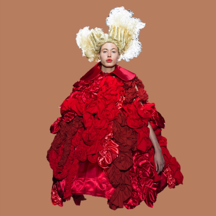 “Why brilliant fashion designers, a notoriously nonanalytic breed, sometimes succeed in anticipating the shape of things to come better than professional predictors, remains one of the most obscure questions in history and, for the historian of culture, one of the most central.” said Marxist historian, Eric Hobsbawm. This sentence perfectly introduces you to Rei Kawakubo’s extraordinary summer, full of blood and roses. Very theatrical it was the SS15 for Comme des Garcons was very politically-historically connected. We switch from 2014 to 1914. Pain, wars, love, favourism, feeling, power- all of these things left a clew in those massive pieces. There was not even a major variation in reds; it was the same rose red, or poppy red, expressed again and again in widely different textures and silhouettes that ran like exploded and tattered versions of an invented history, one of Kawakubo’s own making. It was all RED. And very dramatic and deep. The hair reminded me of Alice in The Wonderland‘s big-headed queen while the exaggerated hoodies felt like The Red Riding Hood. Maybe it’s not hard to live between the world of kids and world of adults? Maybe we shouldn’t initially think of red as blood, but more of love? Rei Kawakubo, the poet of fashion, asks us again a strong question.