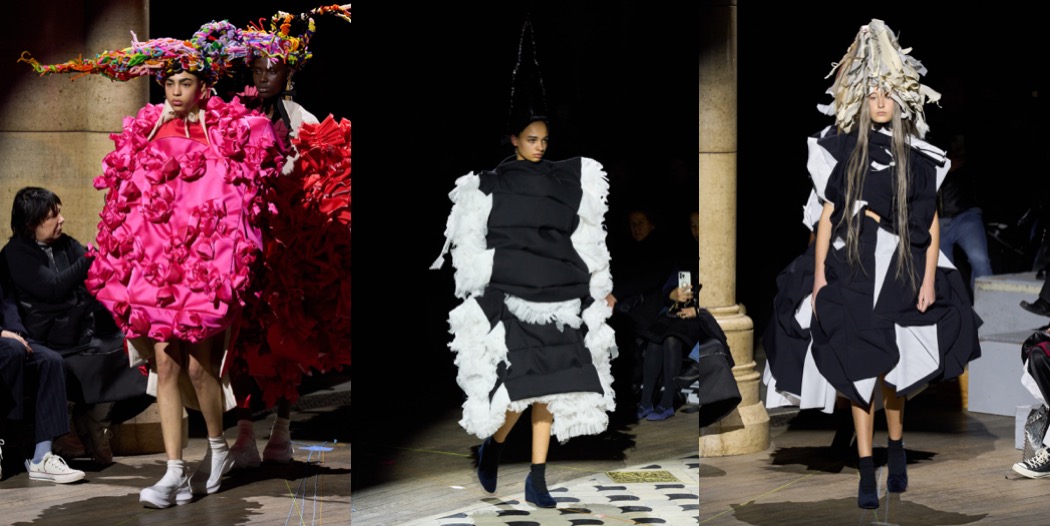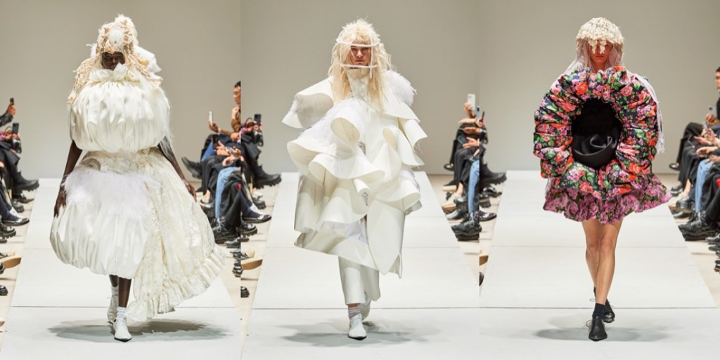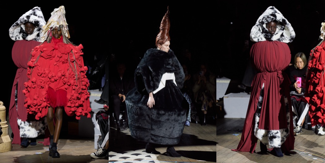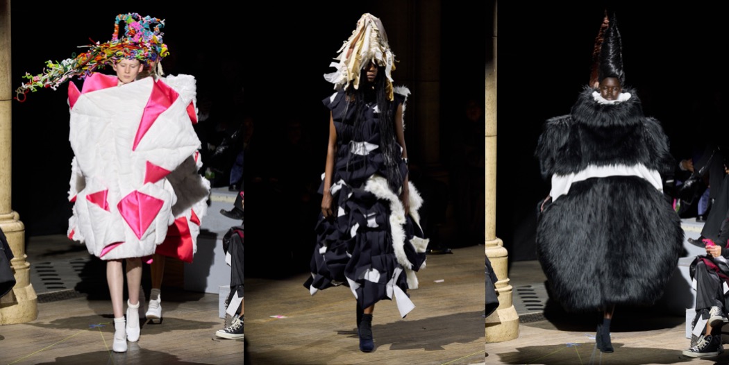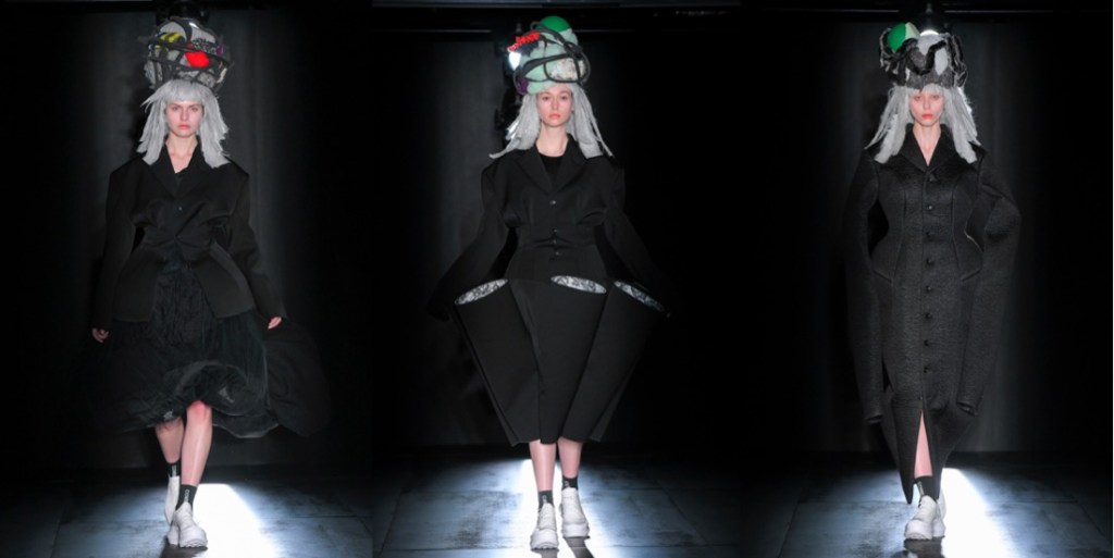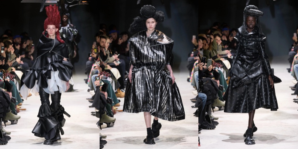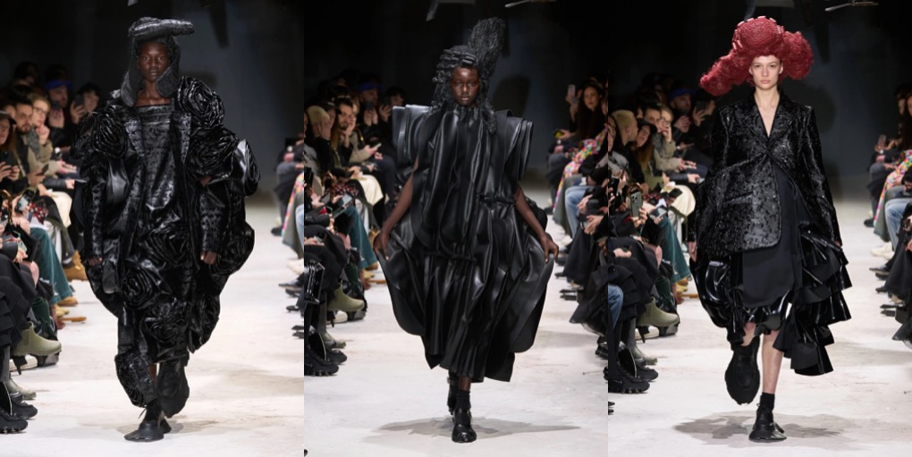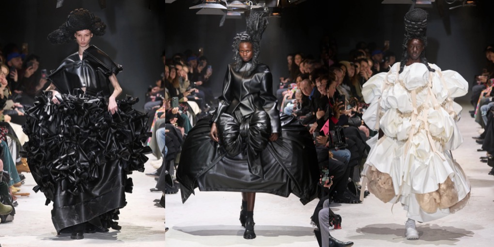 Rei Kawakubo goes back to black. Her Comme Des Garçons collection was simply titled “Anger“. “This is about my present state of mind. I have anger against everything in the world, especially against myself.” Global conflicts, wars that seems to have no ending, general social unrest. Kawakubo seems to be angry at herself for being in the fashion industry, for its schemes and formats, and for being a designer herself. She instructed some of the show’s models to go out and vent, to break the fourth wall that divides the runway from audience. The third model, dressed in black polyurethane exploded-flare pants and a biker-jacket cape, suddenly did a massive clenched-fist stamp of frustration in the middle of the runway. Another model turned and loomed over some people in the front row, confrontationally invading their space with a bow-front pannier skirt. The constructs of extreme historical tropes of femininity – the pileups of rosettes, panniers, bows, and pompadour wigs – seemed to be on the brink of sarcastic self-parody. But then, a bride in white appeared in the show’s finale. Maybe there’s some light of hope at the end of this dark tunnel?