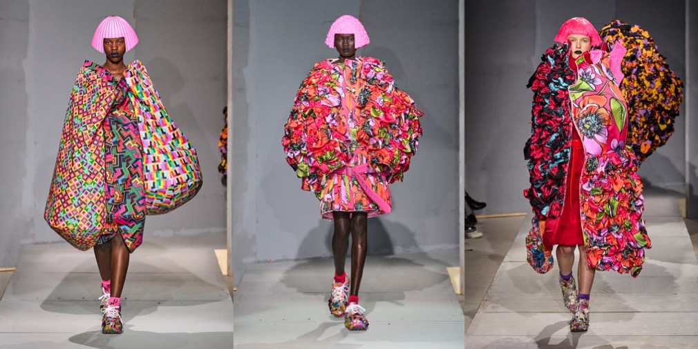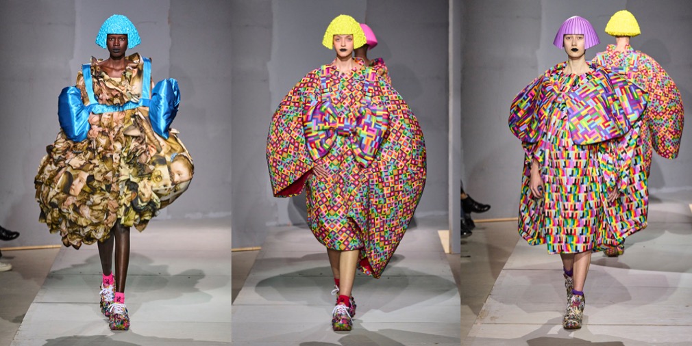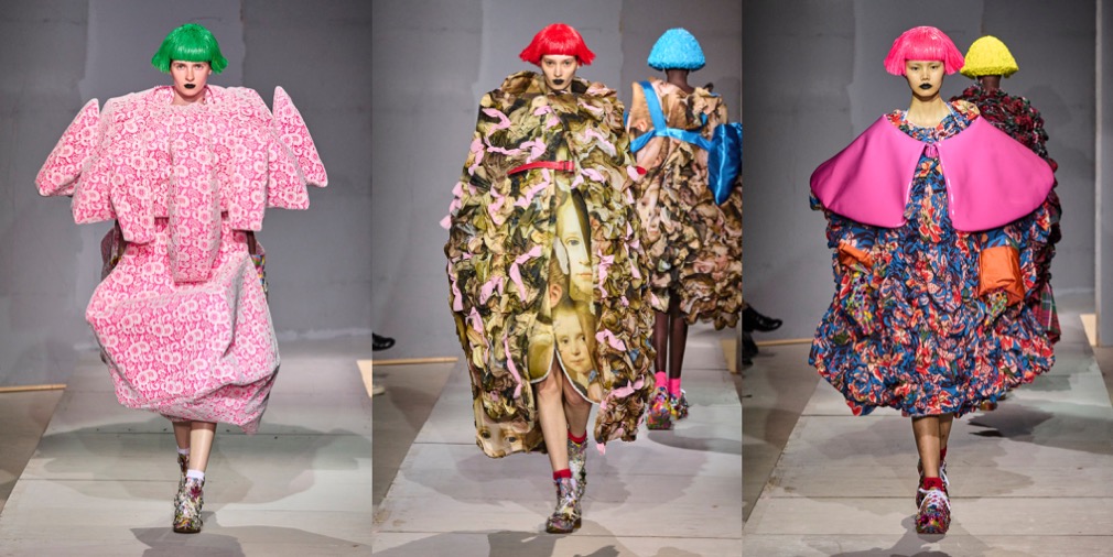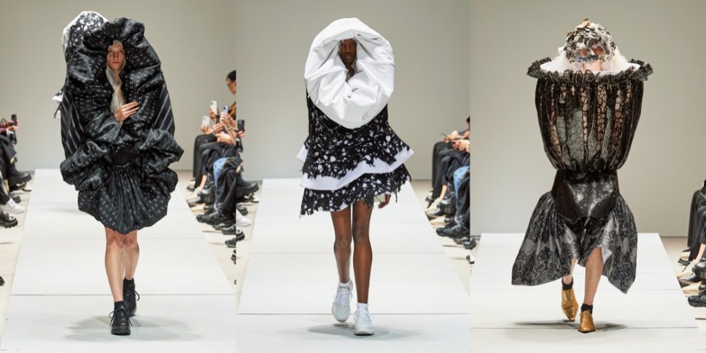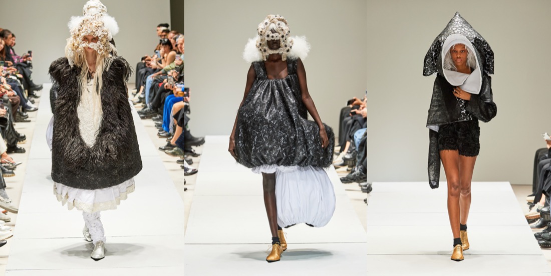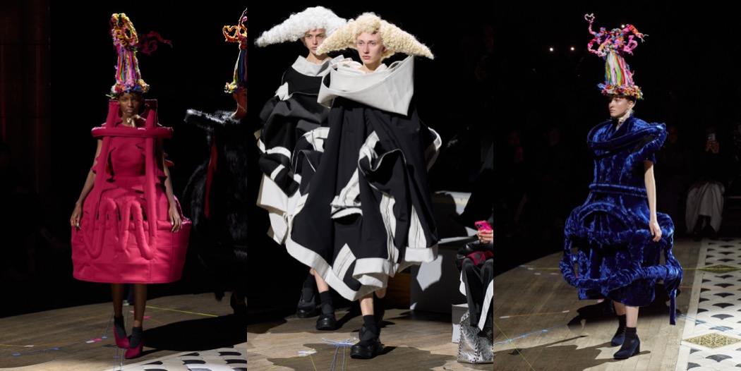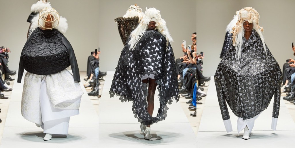 Rei Kawakubo goes back to black. Her Comme Des Garçons collection was simply titled “Anger“. “This is about my present state of mind. I have anger against everything in the world, especially against myself.” Global conflicts, wars that seems to have no ending, general social unrest. Kawakubo seems to be angry at herself for being in the fashion industry, for its schemes and formats, and for being a designer herself. She instructed some of the show’s models to go out and vent, to break the fourth wall that divides the runway from audience. The third model, dressed in black polyurethane exploded-flare pants and a biker-jacket cape, suddenly did a massive clenched-fist stamp of frustration in the middle of the runway. Another model turned and loomed over some people in the front row, confrontationally invading their space with a bow-front pannier skirt. The constructs of extreme historical tropes of femininity – the pileups of rosettes, panniers, bows, and pompadour wigs – seemed to be on the brink of sarcastic self-parody. But then, a bride in white appeared in the show’s finale. Maybe there’s some light of hope at the end of this dark tunnel?