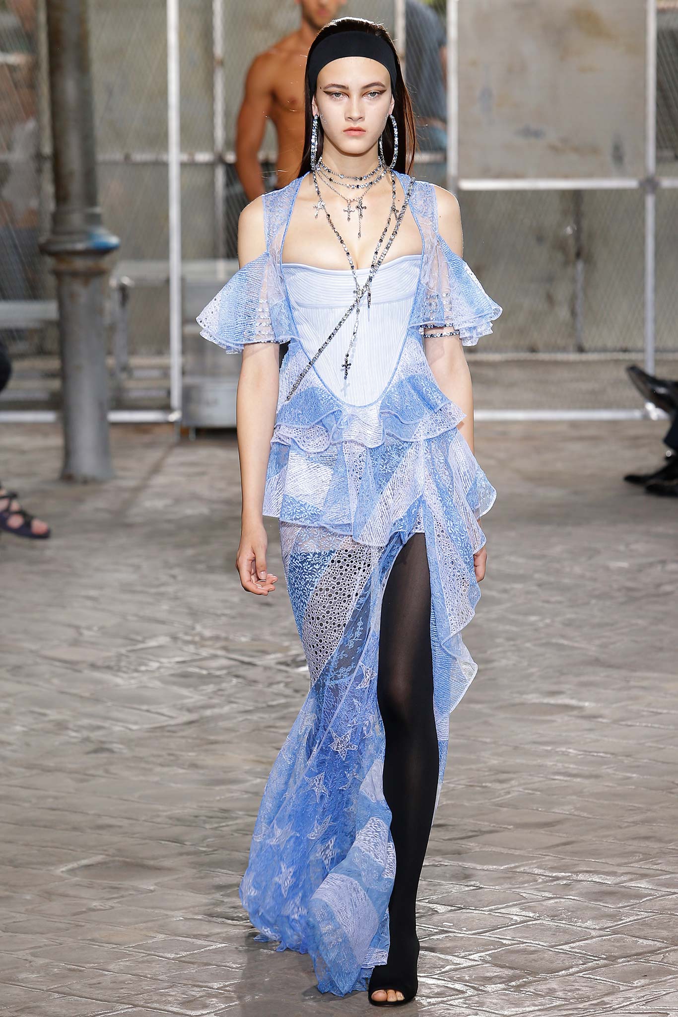 Meanwhile, Simone Rocha staged her spring-summer 2017 show in Southwark Cathedral, where the models walked down the gothic aisle. The venue matched the charming sublimity of Rocha’s latest line of delicate textures and girlie silhouettes, and it smoothly worked with the collection’s British accents. While working on the collection, the designer took a glance at baptismal gowns and communion dresses, reworking them in authentic broderie anglaise lace. But don’t expect to see a traditional wedding dress here. Simone Rocha’s fascination with perversion oozes in those not-so-bride-ready gowns. Although we’re talking about sacred and holy, the designer’s pieces are far from innocent. Sheer organza sheath with elongated sleeves shyly exposed nipples, while a tulle skirt with embroidered flowers showed some leg… accidentally. Note the models’ patent wellies and synthetic-white, rubber gloves. Red lips and wet hair. Rocha’s Catholic girls coming from good village families are naughty. In a very elusive, gentle way.
