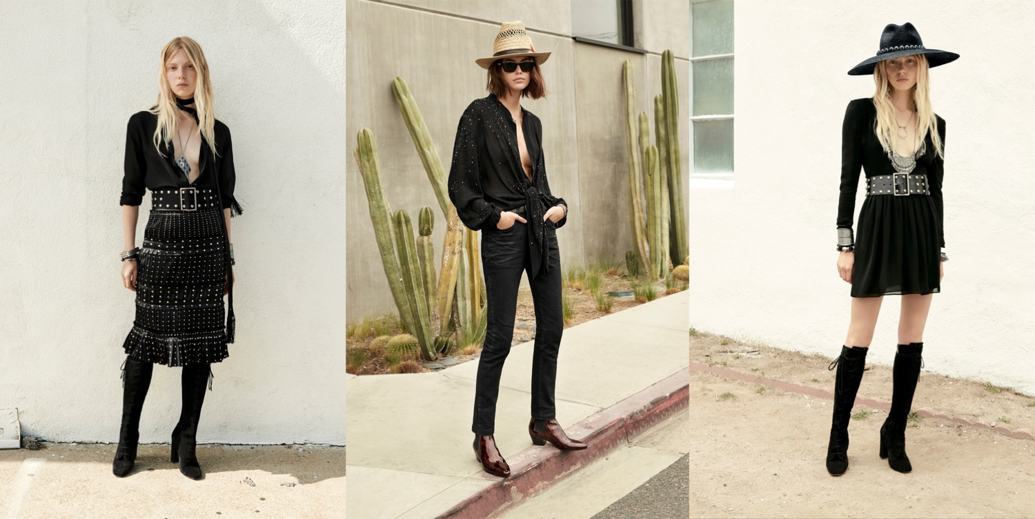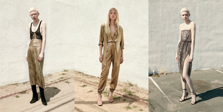 The theme behind Anthony Vaccarello‘s resort 2020 line-up for Saint Laurent is parallel to his spring-summer menswear show staged on one of Malibu’s beaches. For both, Vaccarello had been thinking about how Morocco’s glittering hippie/boho enclaves of the late ’60s and early ’70s (distinctly Yves) are mirrored by the today’s free-spirited California. So, a black velvet smoking jacket, worn with a long black leather skirt with a fastening running down its front; a gold sequin lace camisole with white jeans; a pleated lurex skirt styled with boots, a barely-there tank-top and a big, heavy pendant… in terms of fashion, there’s nothing innovative (or even fresh) in Vaccarello’s “day-to-day” vision of a wardrobe. It nods to Yves’ eternal chic, yes, feels very California, yes, but in the end it still looks like Hedi Slimane’s work for the house from the (not so distant) past. Really, how do clients choose between a denim, maxi-lenght skirt from Slimane’s Celine offering, and a nearly identical one with a Saint Laurent tag?