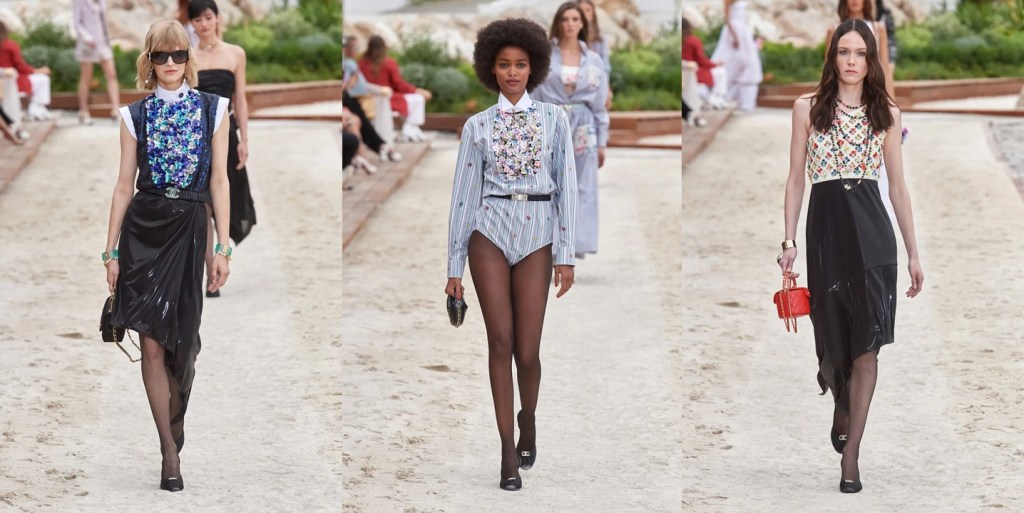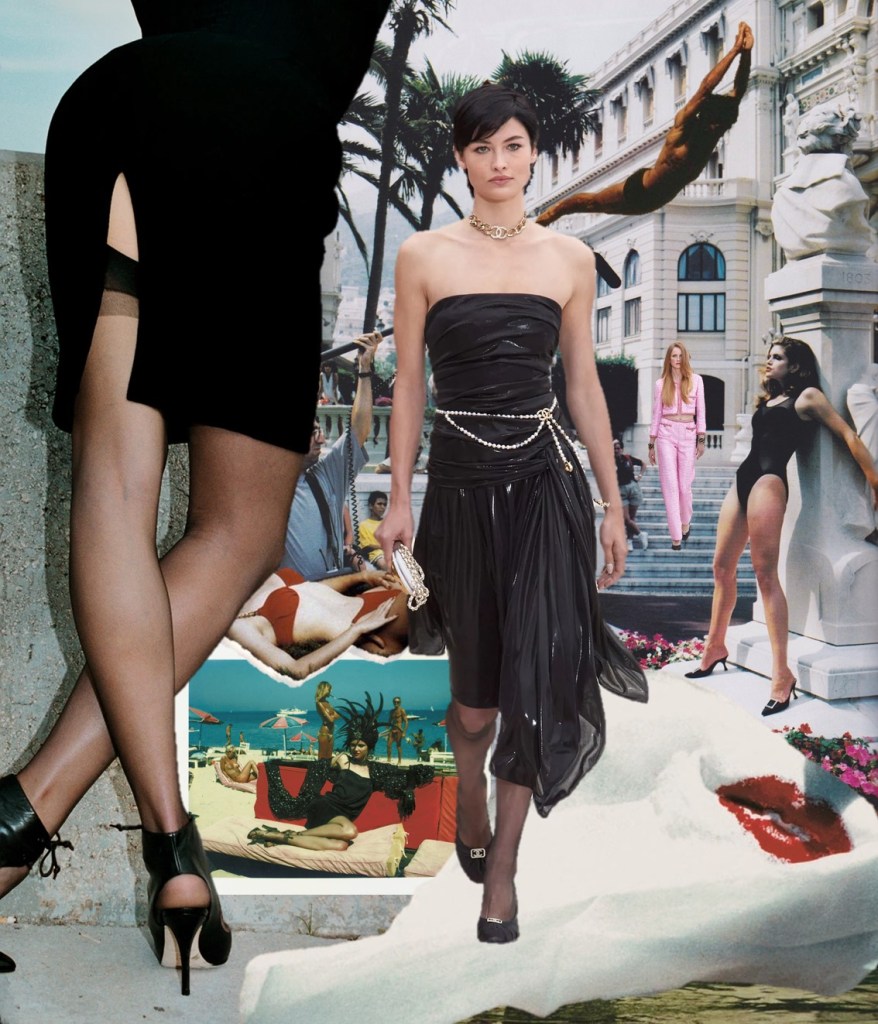 Michele has often built on the tension and vitality of the past to write his own version of the present. “Clothes are mediums, strata of languages,” he said. “Today, ‘making fashion’ doesn’t mean just being a tailor, or chronicling just a one-dimensional narration. Putting together a collection has to do with talking about your idea of the world, because fashion is deeply connected to life and to humanity. Fashion isn’t just a hieroglyph that only élites can understand. It’s about life, it speaks a multitude of idioms, it’s like a huge choir from which nobody has to be excluded. It’s like being at sea, in the ocean, and casting out someone or something is not being fair to the complexity of life.” The designer’s journey this season manifested in a show intended “as a rave,” he explained, where his skills as a costume designer were boosted by the theatricality exuded by the location. “I thought the castle shouldn’t be kept shrouded in silence, but had to be lived and celebrated as it probably was when it was built, a sort of California, the Silicon Valley of the time.” Under a serendipitous full moon, his constellation of characters paraded around the fortress, lit by projections of stars and galaxies. While the idea of cosmogony was only tangentially translated into actual shapes or decorations, the designer’s recurrent theme of metamorphosis was hinted at through unobtrusive prosthetic insertions in some dresses, and also by an unrelenting, flowing panoply of divergences. Chatelaines and go-go girls, demure bourgeois ladies and spectacular nocturnal creatures, long-limbed lovers of bondage sheathed in thigh-high, laced-up stiletto-boots and romantic heroïnes swathed in yards of velvet—it was a feast of coherent discordances, tied together by historical references (portrait collars, plissé gorgets, crusaders’ capes, trains, and medieval crinolines) and by the “incendiary shimmer,” as he called it, of luminous textures under the light. “Women have often worn constellations on their bodies,” Michele said in a sort of conceptual pirouette. “Just think of Marilyn Monroe’s famous last dress studded with crystals; she looked like the beautiful tail of an impalpable comet.” What comes around goes around, but no one performs past-to-present magic quite like Michele.