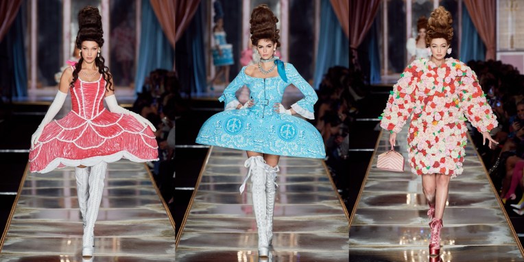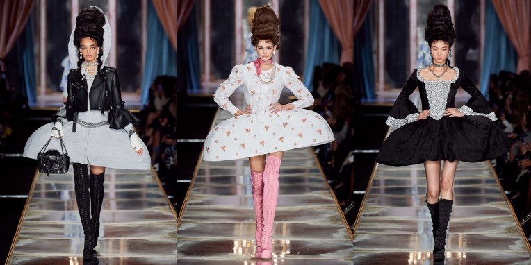 I suddenly started enjoying Jeremy Scott’s Moschino last season, when he showed the super camp intepretation of fashion-meets-art. His work lately is absolutely un-commercial, and that might be reason looking at it is so amusing. For autumn-winter 2020, he chose a total fashion cliché: Marie Antoinette. Karl Lagerfeld did a Chanel collection dedicated to her. Last season, Thom Browne had his models wear painful-looking crinolines, corsets and big hair fit for the Versailles. In Milan, Scott clashed Marie Antoinette pannier dresses with the most emblematic womenswear garment of the radical 1960s, the miniskirt. Scott’s mini pannier came in various iterations: gold brocade on denim, white biker, black biker, and toile de Jouy. This archetypally 18th-century pattern was used across the collection with the original faces of its cavorting courtiers transformed into wide-eyed anime characters. The kitschy, cake-based finale that was served was hilarious and provided total visual oversaturation with all its sweetness and icing-like details. Let them eat (and wear) cake.