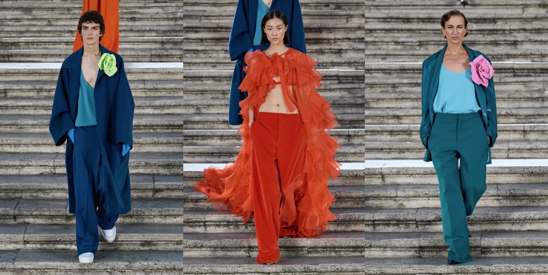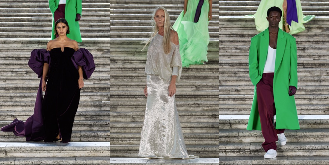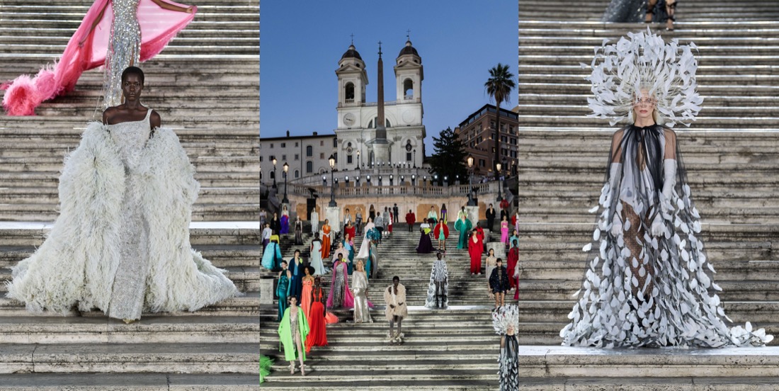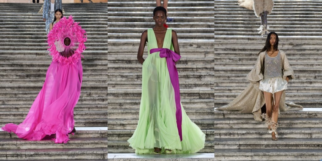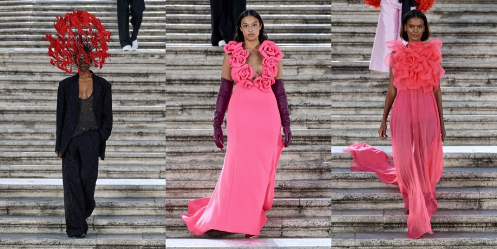 For Valentino’s spectacular autumn/winter 2022 haute couture show, creative director Pierpaolo Piccioli returned to Rome, where Valentino Garavani founded the storied maison back in 1959. Otherworldly bodies descending from the Spanish Steps in the golden evening sun, the romantic voice of Labrinth echoing from beneath the Trinità dei Monti… well, that was a scene. “I start from the finale, always,” Pierpaolo Piccioli said during a preview in Paris days before the show. “What I have in mind is these liquid, colourful drops coming down from the Steps, the volumes light and in movement.” He titled his show The Beginning: a return to the city where Valentino Garavani founded his maison, a place that has moved with the winds of change since the dawn of time. Like Piccioli’s Valentino, Rome’s codes may remain the same but its values are in eternal evolution. That was the sentiment behind a show he envisioned as “a conversation with Valentino” across the past, the present and the future. Piccioli had been dreaming of doing a show on the 18th-century steps. “It’s very personal. The last time Valentino did a show on the Spanish Steps was in the 1990s. It was a different moment in fashion. It was about lifestyle and the perfection of beauty, the glamour, the supermodels,” he reflected. “I wanted to get the spirit of Valentino – the joie de vivre – because I think it’s the only way of making beauty resilient to the time. On the other hand, there’s a picture I want to deliver, which is different from what it was 45 years ago. It’s the picture of what we live in. The Spanish Steps are the same, the atelier is the same, and in the end, clothes are clothes. I like to keep the rituals of haute couture. But the real difference is in the casting – in the humans – that can tell stories and witness a different moment in this world. I want to empower them and give them a voice and the opportunity to tell their own stories.”