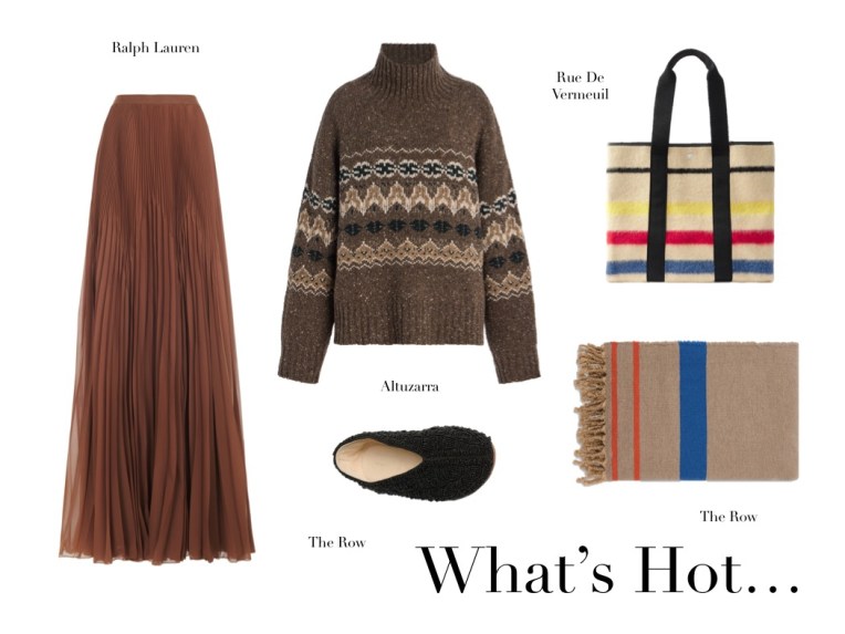 What’s Hot (8.8.25) August 8, 2025 | Design & Culture by Ed GET THE LOOK: RUE de VERNEUIL Traversée Glacier Large Webbing And Leather-trimmed Striped Felt Tote Altuzarra Cecie Fair Isle Wool-blend Turtleneck Sweater Ralph Lauren Collection Masina Satin Maxi Skirt The Row Fioko Fuzzy Edge Cashmere Scarf The Row Claudette Leather Point-toe Flats