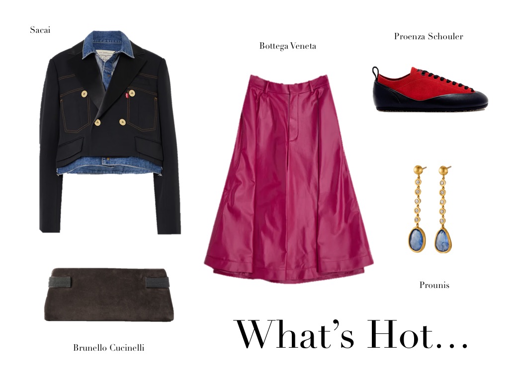 What’s Hot (2.6.25) June 2, 2025 | Design & Culture by Ed GET THE LOOK: Bottega Veneta Pleated Glossed-leather Midi Skirt Sacai Layered Wool Denim Jacket Brunello Cucinelli Bead-embellished Leather-trimmed Suede Clutch Prounis Diamond and Faceted Blue Sapphire Tear Chime Earrings Proenza Schouler Bicolor Leather Low-Top Sneakers