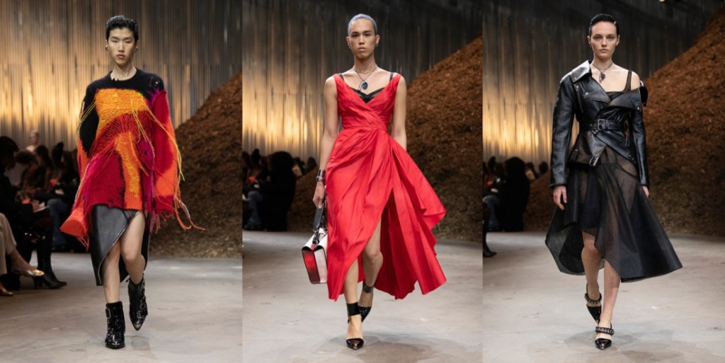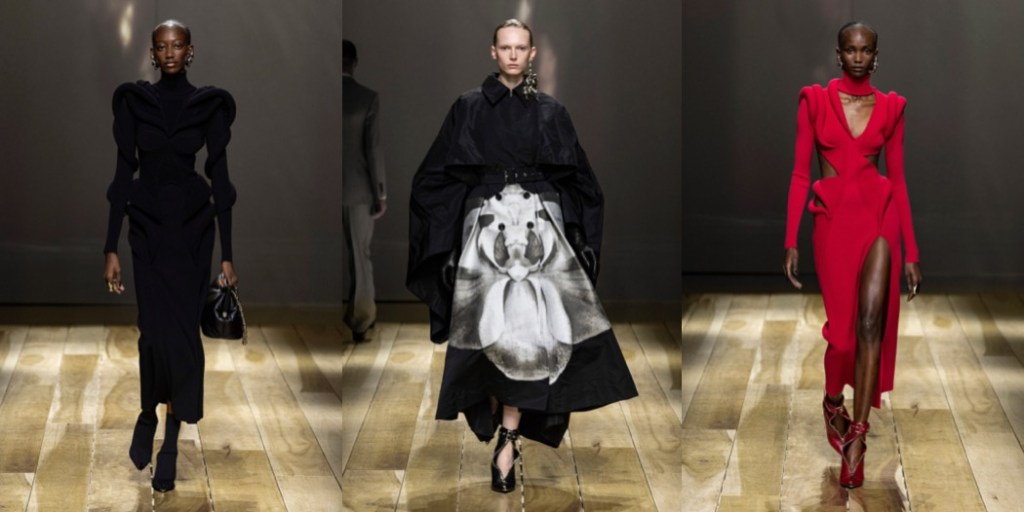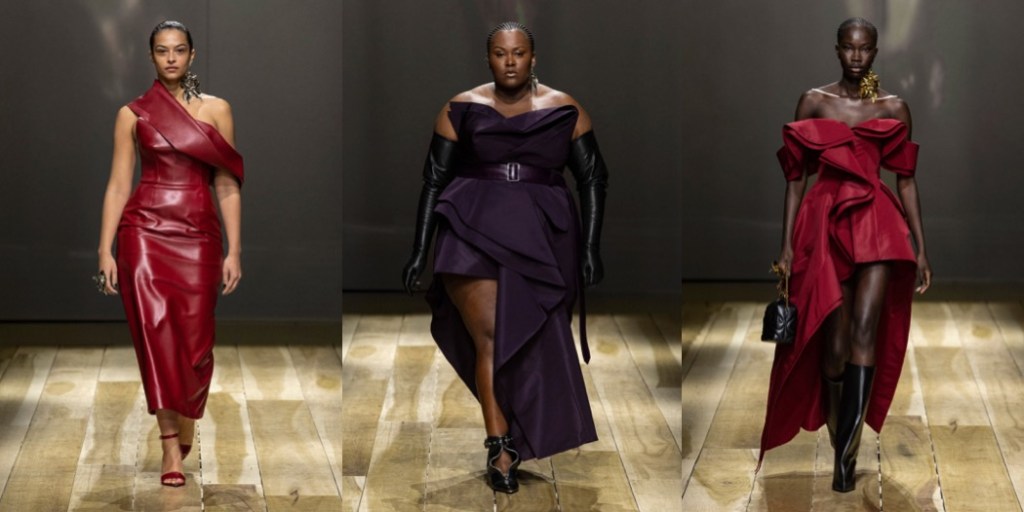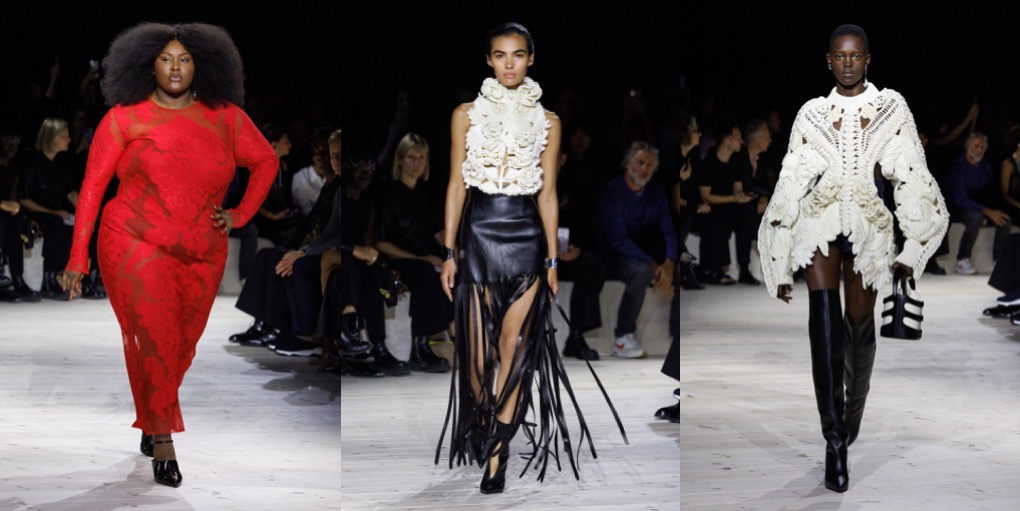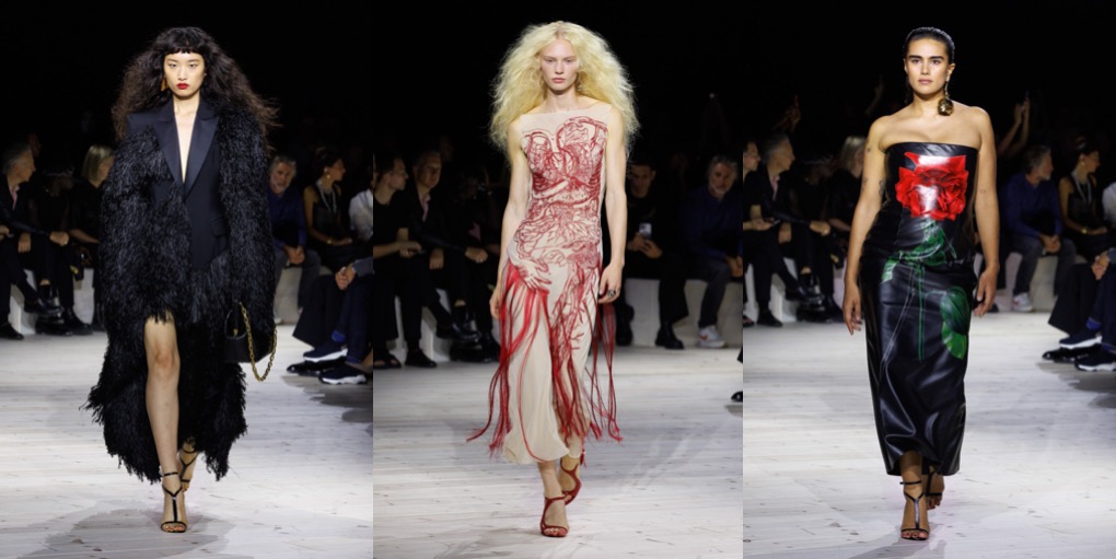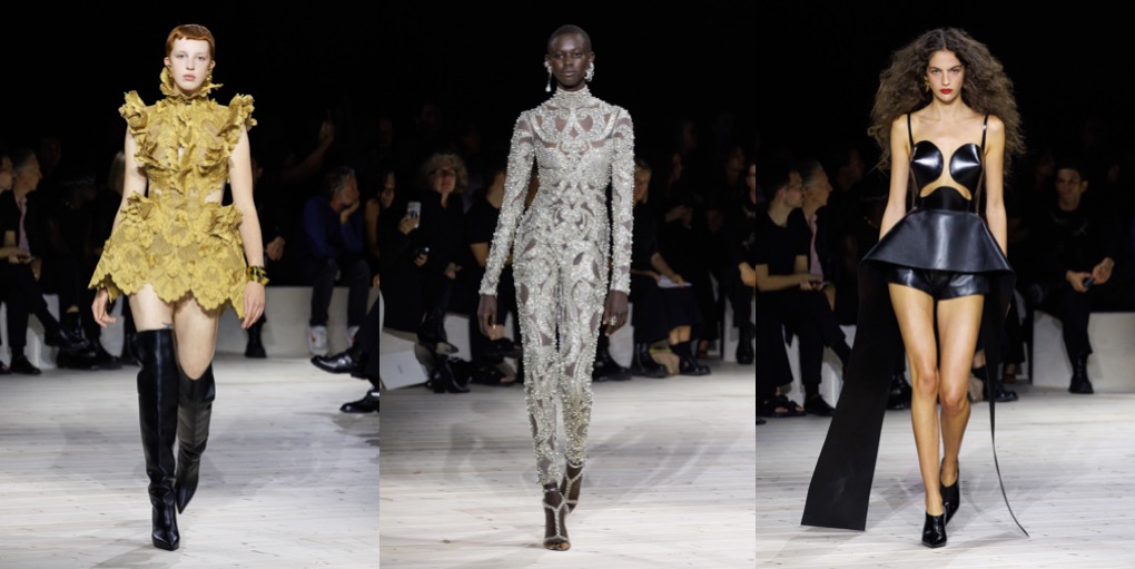 That sense of assuredness was present in Sarah Burton’s debut collection for Givenchy. It was a confident outing, one that put the brand back on the fashion map – and into conversations. But it doesn’t mean it was flawless. The opening look, an open-work bodysuit, would be just fine if not the tacky, in-your-face logo. The over-sized suits would feel a bit more powerful if they had a more distinct cut. The eveningwear was neither sharp or soft: it was somewhere in-between, subtly inspired by the couture history of the maison, but also trying to look modern. I was never a big fan of Burton’s work at Alexander McQueen, especially as her last years for the brand unfurled. Although her Givenchy offering feels less superfluous and more directed towards a real woman, I can’t help but see cues taken from Phobe Philo’s eponymous brand. Just look at the asymmetric, high-neck dress or the leather-wear.