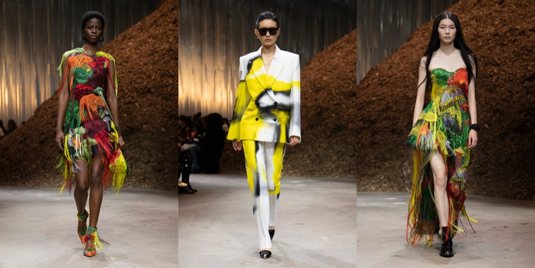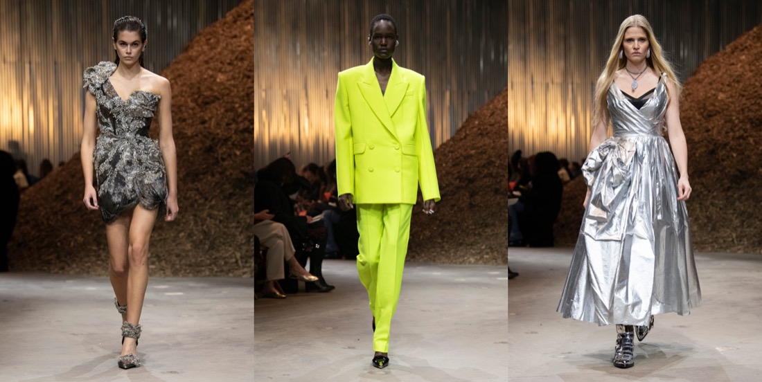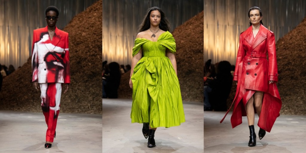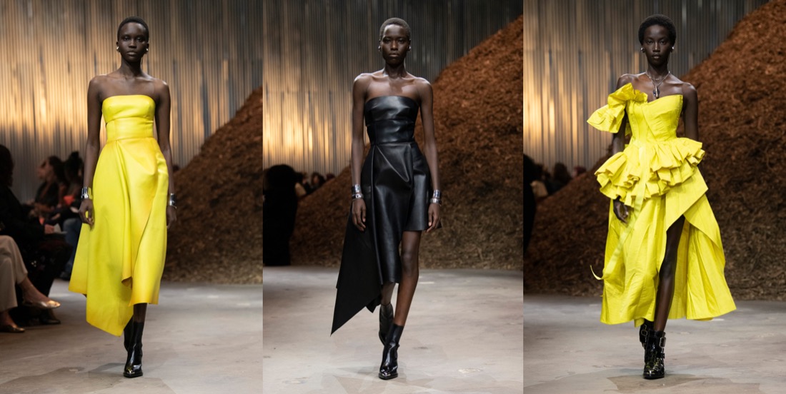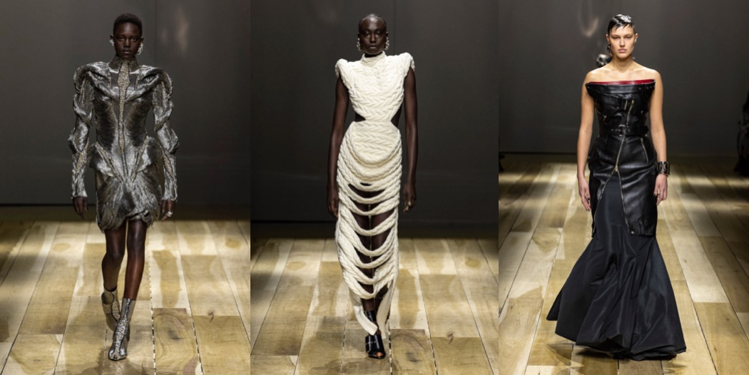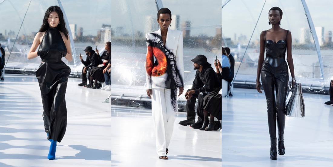 That sense of assuredness was present in Sarah Burton’s debut collection for Givenchy. It was a confident outing, one that put the brand back on the fashion map – and into conversations. But it doesn’t mean it was flawless. The opening look, an open-work bodysuit, would be just fine if not the tacky, in-your-face logo. The over-sized suits would feel a bit more powerful if they had a more distinct cut. The eveningwear was neither sharp or soft: it was somewhere in-between, subtly inspired by the couture history of the maison, but also trying to look modern. I was never a big fan of Burton’s work at Alexander McQueen, especially as her last years for the brand unfurled. Although her Givenchy offering feels less superfluous and more directed towards a real woman, I can’t help but see cues taken from Phobe Philo’s eponymous brand. Just look at the asymmetric, high-neck dress or the leather-wear.