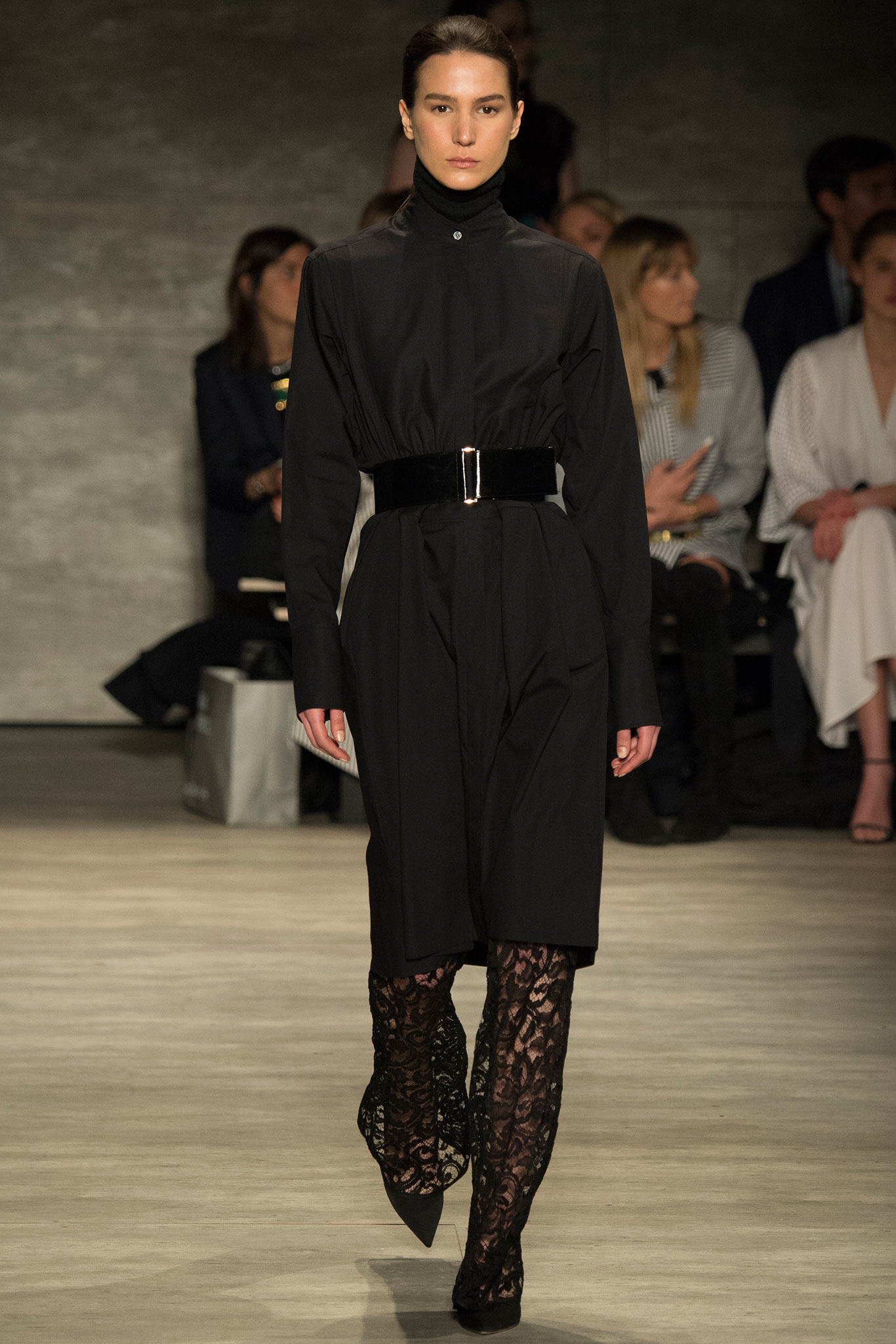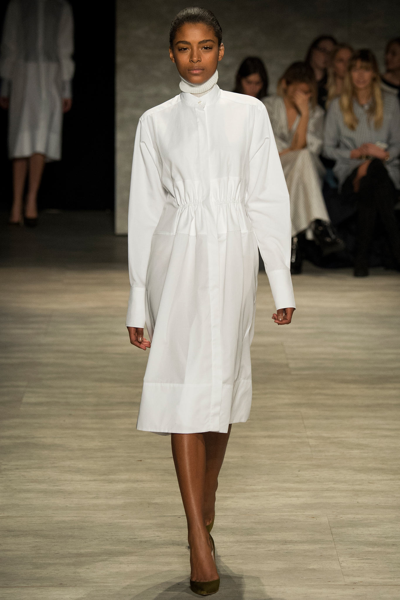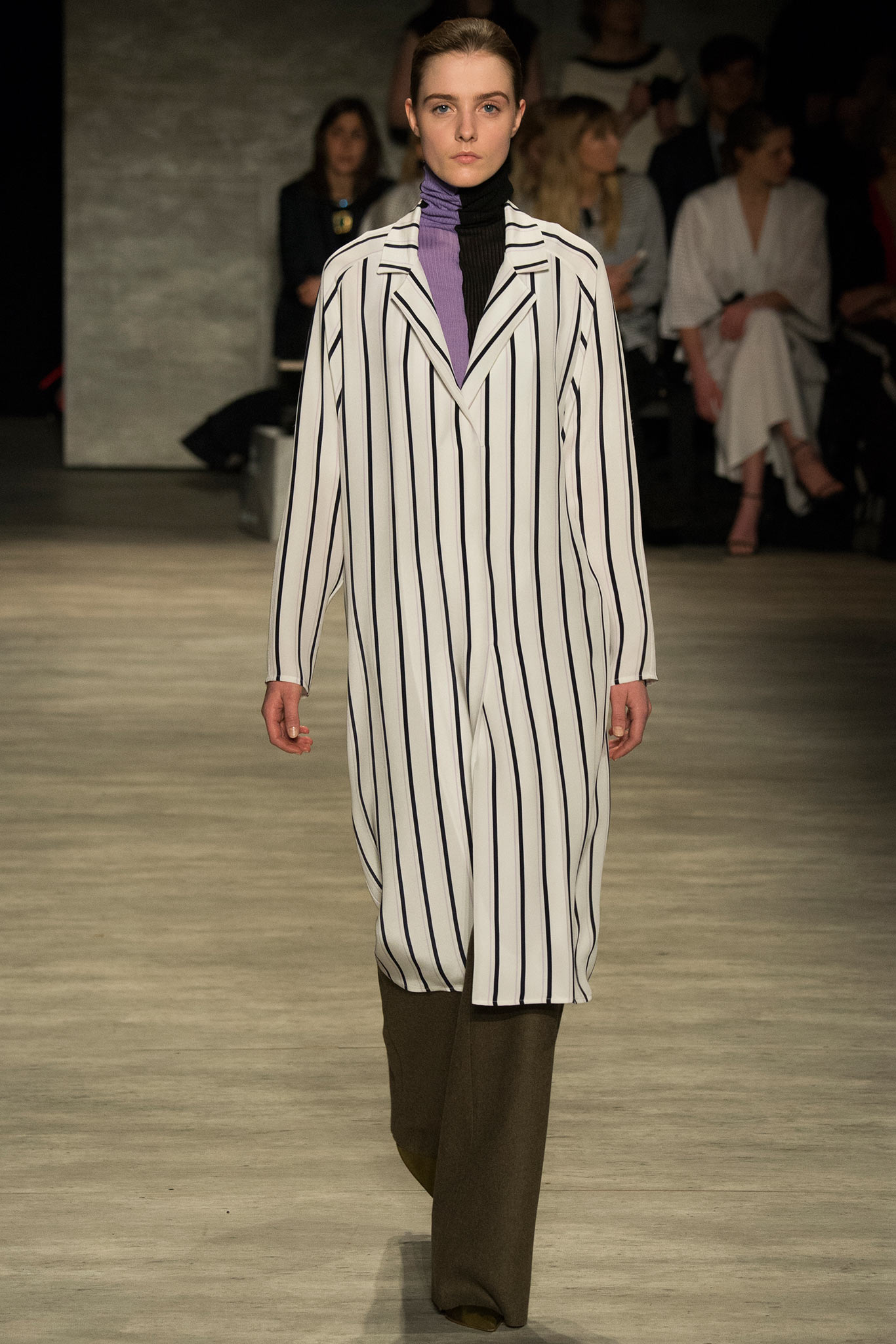 Another quintessential New York addition: the Marc Jacobs collaboration. Jacobs’s section riffed on his recent collections with block letter intarsias spelling out FendiRoma rather than his own logo on everything from tracksuits and trucker jackets and matching jeans to an oversize terry robe. The faux fur XXL hats, which we’ve seen the last time on his autumn-winter 2012 runway, wowed the audience just like they did a decade ago. “I called Marc up and asked him if he wanted to design a collection for Fendi. I haven’t been involved at all,” Jones explained the collab. “We worked side by side during fittings. We were doing ours, he was doing his. I’m looking very much at 1997, and I think Marc’s is fresh and now.” Jones was after more of a feeling. “I was thinking about when I was first coming to New York and we would go out clubbing,” he said. Hence the irreverent, high/low mix of sequins and utility jackets, or a shearling sherpa and a mini. He meant what he said about utility. Even beanies and gaiters came with built-in Baguettes, as did many of the garments, those shearling sherpas most temptingly. Surprisingly, it all felt very early Sex & The City and Patricia Field style. For the kicker, Linda Evangelista, who is the current face of Fendi, glided out, resplendent in an opera cape, with a sterling silver Baguette bag in the crook of her arm. Jacobs, who joined Jones and Venturini Fendi for a bow, encouraged everyone to stand up – not that the crowd needed any convincing.