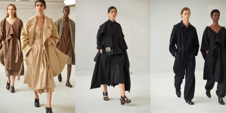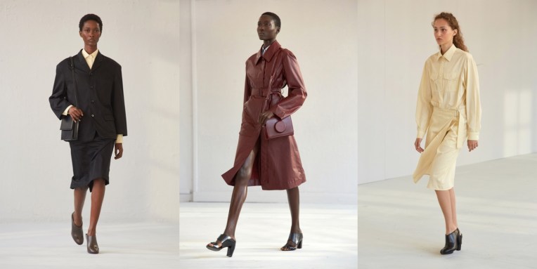 Christophe Lemaire and Sarah Linh-Tran – who has given birth since the Lemaire show in January – wanted to deliver a collection that felt “awakened”. It certainly was awakened in terms of sensuality. The Lemaire man and woman are sheding cocooning layers and confidently reveal some flesh, a lot more leg. Think a super-chic crinkled leather, knee-length skirt worn with a blazer and a pair of mesh sock-sandal heels, or else silky culottes that gave baggy drawers a sensual spin. One look was especially unexpected: a beautiful lace dress in ochre, worn with an oversized trench coat and chestnut pumps. You don’t see lace frequently on the Lemaire runway, and it felt so right.