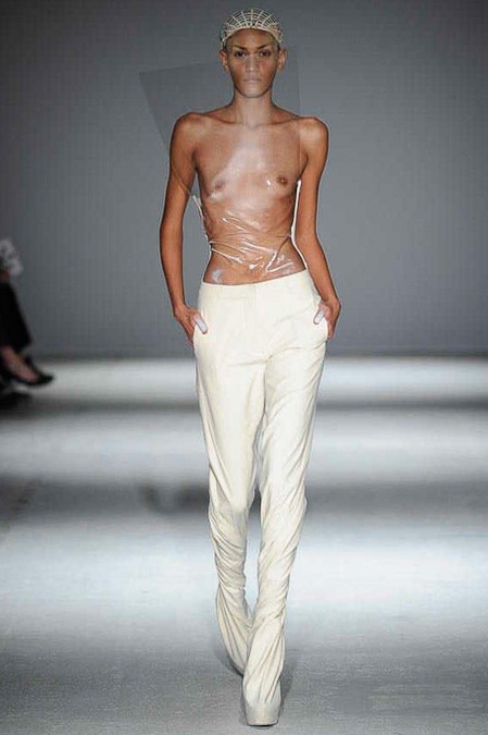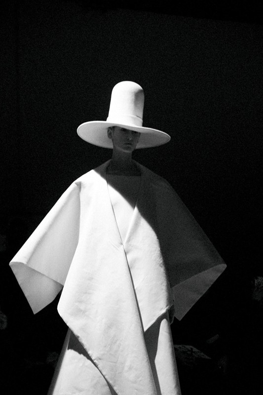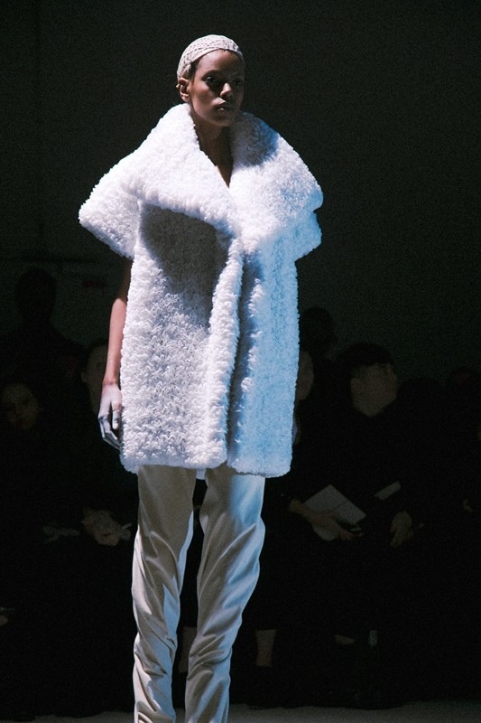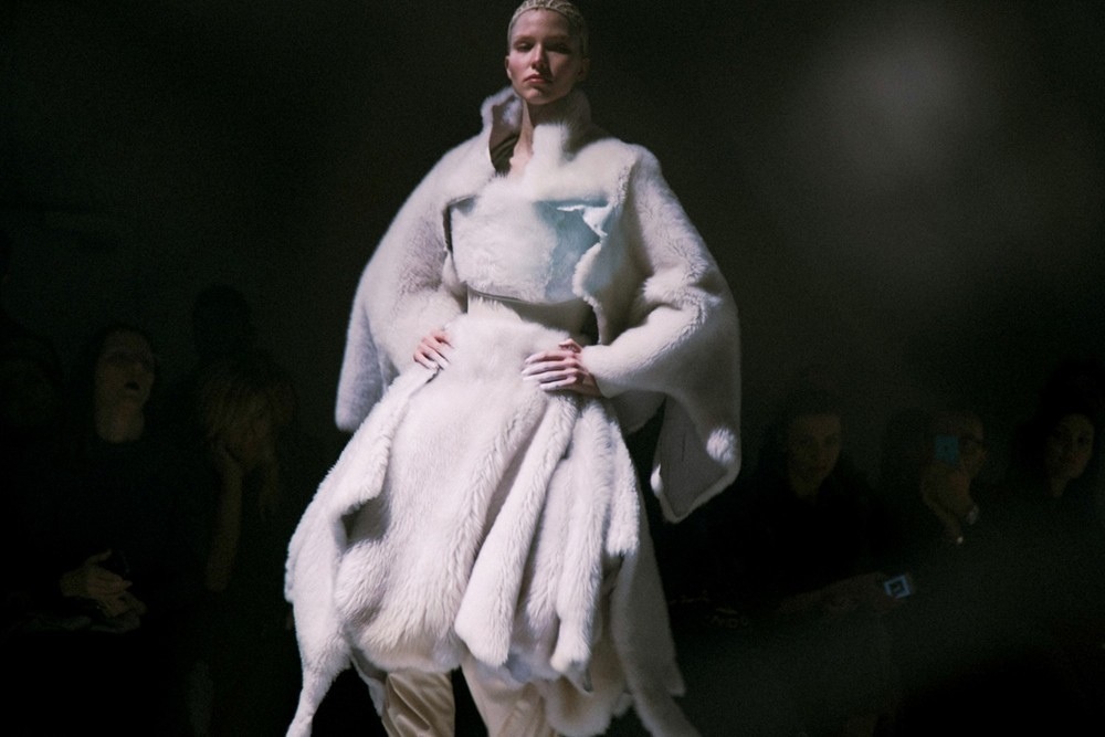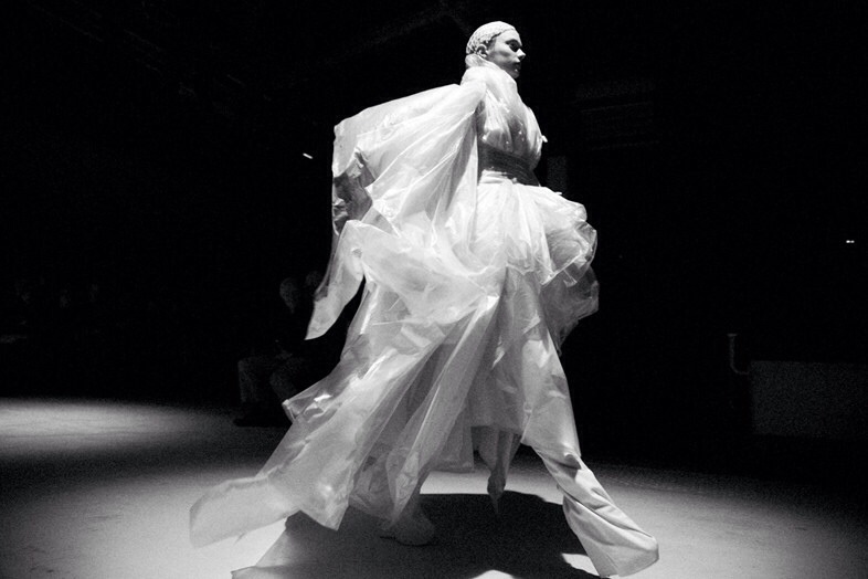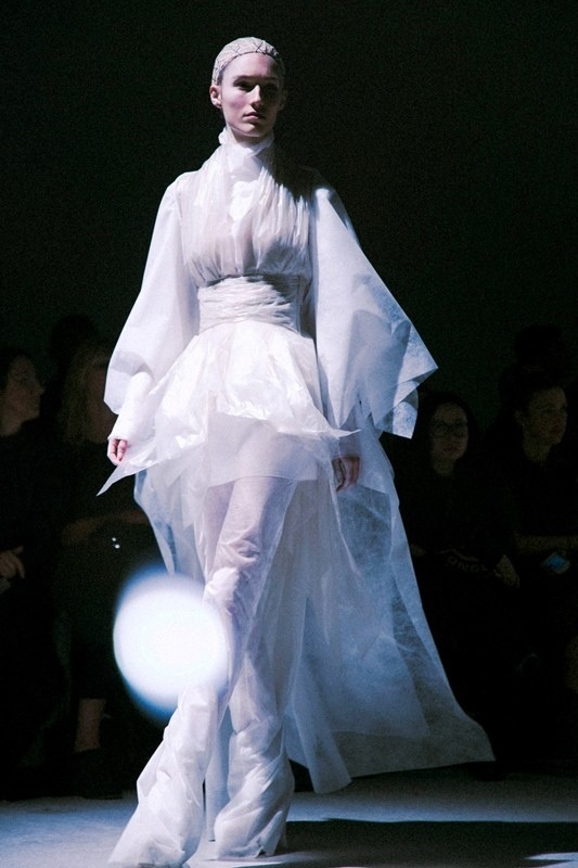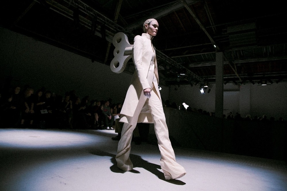 Couture season has started, baby! Schiaparelli kicked of the haute week in Paris with musings on sci-fi and the future. The final result of Daniel Roseberry‘s plunge into all things Alien and Elsa Schiaparelli was, however, more about retro-tech with grand, surreal gestures. Huge funnel-like necklines disguised the face behind screens of lace; champagne-hued ballgowns with silk bows that jutted out near-endlessly appeared to defy gravity; and floor-length beaded fringes that moved energetically as if from Planet Glam all conjured astronomical flourishes of high-art-meets-high-fashion. Elsewhere, silver spine-like bijoux (a nod to Schiaparelli’s 1938 skeleton dress) that sprouted from the back of a black corset paired with a latex skirt and a polished parure, and a perfectly curved cream jacket offered all the alienistic edge a line of space-ready silhouettes could need. The mini-dress made out of discarded technology relics can be read as a comment on tech-waste, a problem that we face globally. But you can also perceive it as a new take on embellishments and embroideries. “Now, the technology I grew up with is so antiquated that it’s almost as difficult to source as certain vintage fabrics and embellishments,” said Roseberry in his show notes. Model Maggie Maurer – an IRL freshly-baked mother – carried a baby doll made from motherboards and microchips. That all might have felt quite too much for a Monday morning, but at Schiaparelli there seems no such thing as restraint.