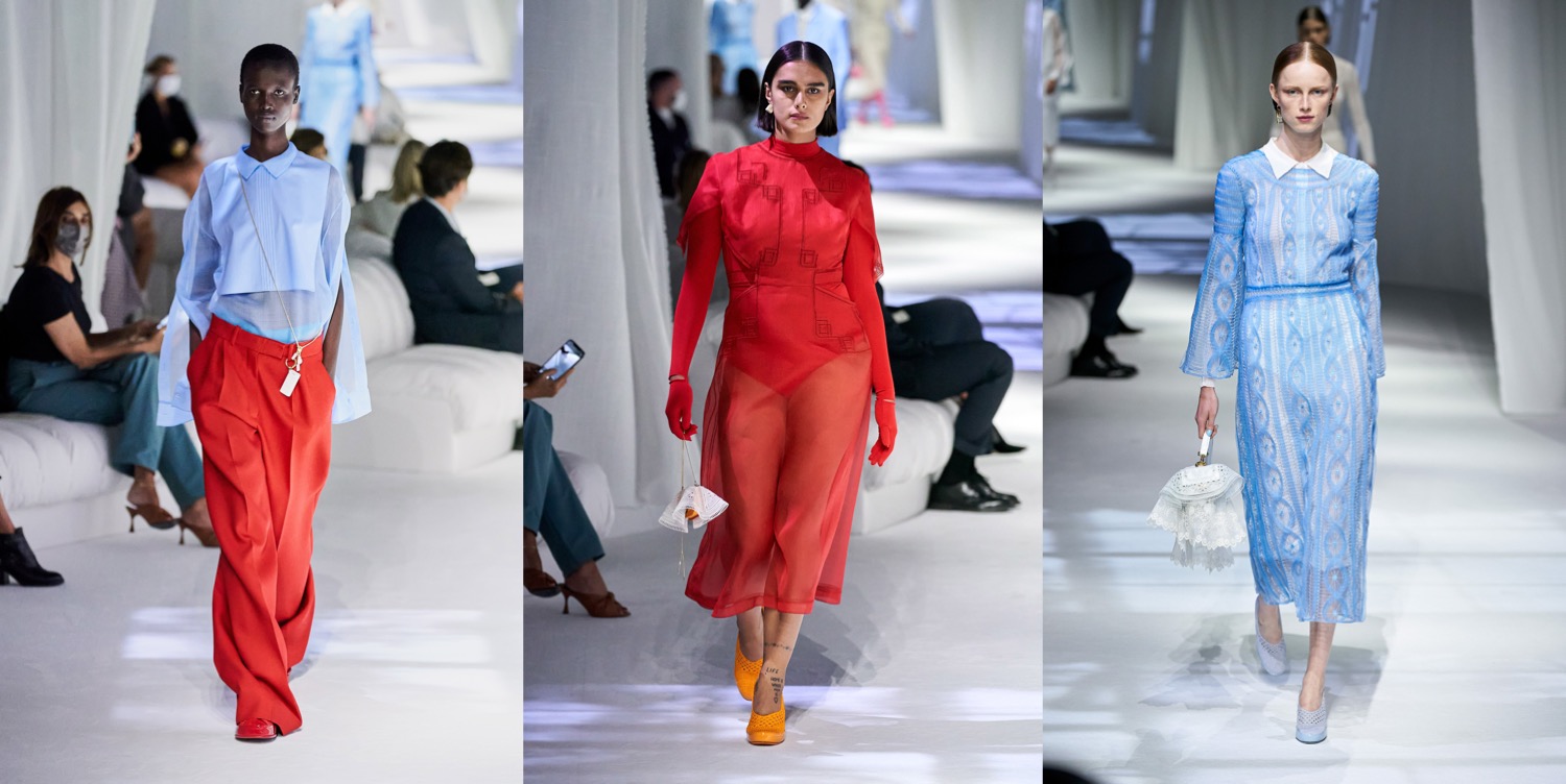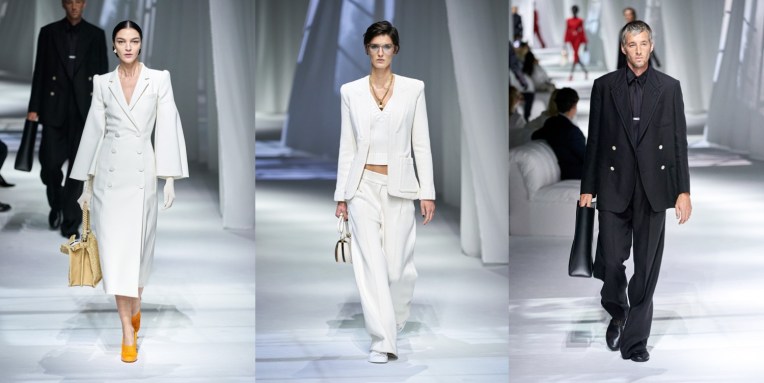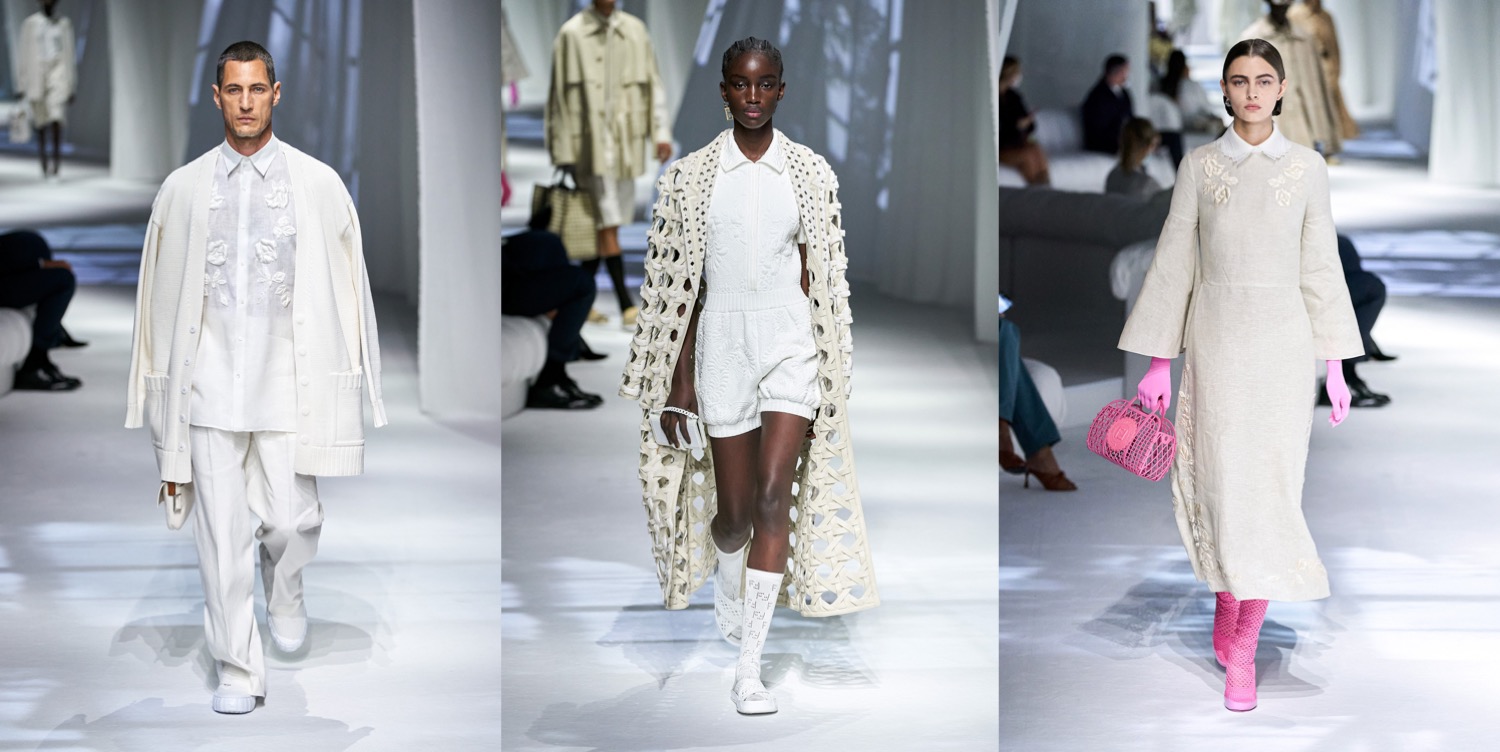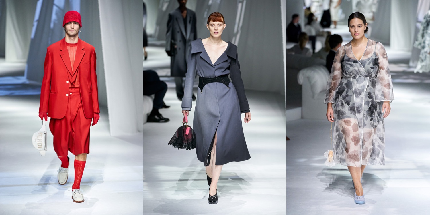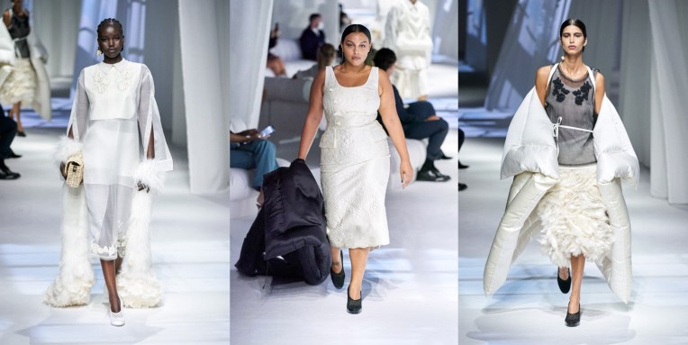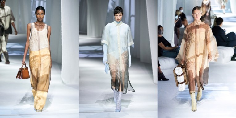 Silvia Venturini Fendi‘s solo vision at Fendi is sublime – so I really wonder why she has appointed Kim Jones as the co-director of the womenswear. Well, I know why – he’s done commercial magic at Dior Men, so why not do the same at Fendi… But back to Silvia’s spring-summer 2021 – again, it’s incredible and it appeared to be a great start of live-slash-digital Milan Fashion Week. It felt so delightfully Italian, as if taken straight out of a Fellini film. The show opened with prints of photographs taken during lockdown by Silvia Venturini Fendi from her bedroom window, which was a nod to the domestic life we’ve all inhabited in the last couple of months. It closed with Leon Dame and Paloma Elsesser amongst those swathed in snuggly satin quilting and pale lace embroidered linens. “This reminded me of Karl,” said Fendi pre-show: “He had a love for bed linen, he had a big collection.” The loungewear and pajamas and floaty wood-printed caftans had a follow-on relationship to last season’s ‘boardroom to boudoir’ collection; “but here,” said Fendi, “she was a little more… sweet.” Much of the collection was cut in barely-dyed but beautifully embroidered linen, a fabric Fendi said she had chosen thanks to its simplicity and sustainability. Runway bags ran from a sweetly naif rattan version of a child’s beach bag to a wicker picnic basket that was a nod to Fendi’s wonderful recent menswear ‘gardening’ collection, co-designed with Luca Guadagnino. And the model casting was amazing, as well: Karen Elson, Maty Fall, Ashley Graham, Eva Herzigova, Yasmin Le Bon, Jill Kortleve and Penelope Tree were all part of a cast as diverse as the swathe of reminiscence Fendi was mustering in this collection. Naturally there were some sections in fur. Maty Fall wore a loosely woven coat of nappa and mink over a floral-pressed romper, while Aliet Sarah a striking skirt of shaved mink ‘lace.’ “I wanted to talk about values,” she explained. “At this time to just talk about fashion seems not enough. I wanted to talk about the values that are behind fashion, and I can tell you that there are a lot. In my family we have always put great meaning into what we do. Here I wanted to achieve clothes that are about the moment, but which also are part of your life, for your life.” By presenting clothes and accessories that whispered of past manifestations of Fendi’s history Silvia was also looking to a future in which garments function as cherished furniture, ever more redolent with memories and meaning in a long and fruitful life.