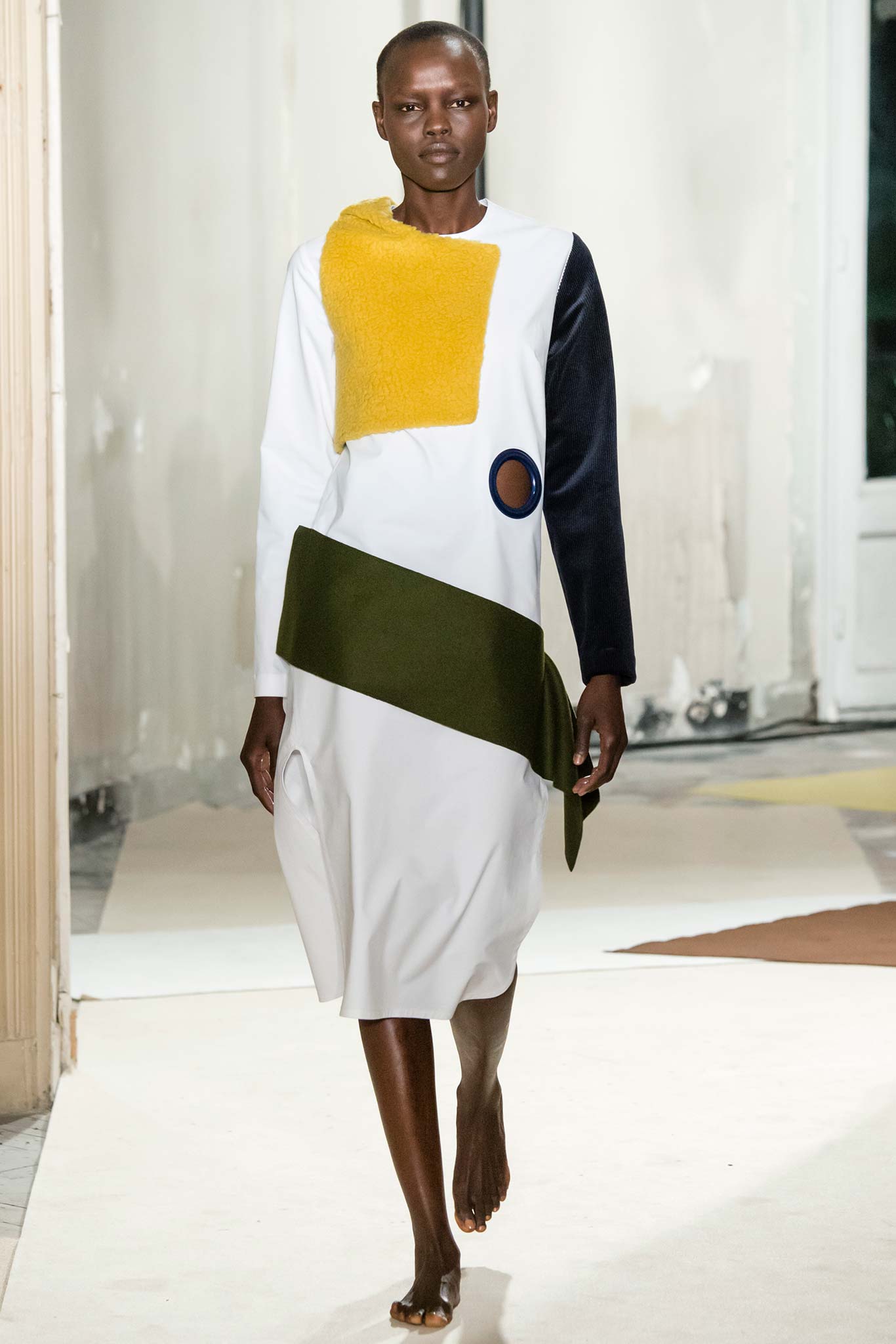 Jacquemus gave homage to his homeland, France showing the patriotic flags on the shirts. Evident in his white, red, and blue palette and the fabulous white shirt with a Tricolore pocket. Other standouts included a cropped crewneck jacket paired with a low-slung pleated skirt, sweater-skirt combos, a T-shirt dress with trompe l’oeil red bathing suits, and lots of navy and white pin-striped cotton. This label is on my Hot list (the pool idea is stunning) and as for me it’s a bit similar to Julien David! Like if even Jacquemus was trained by David…