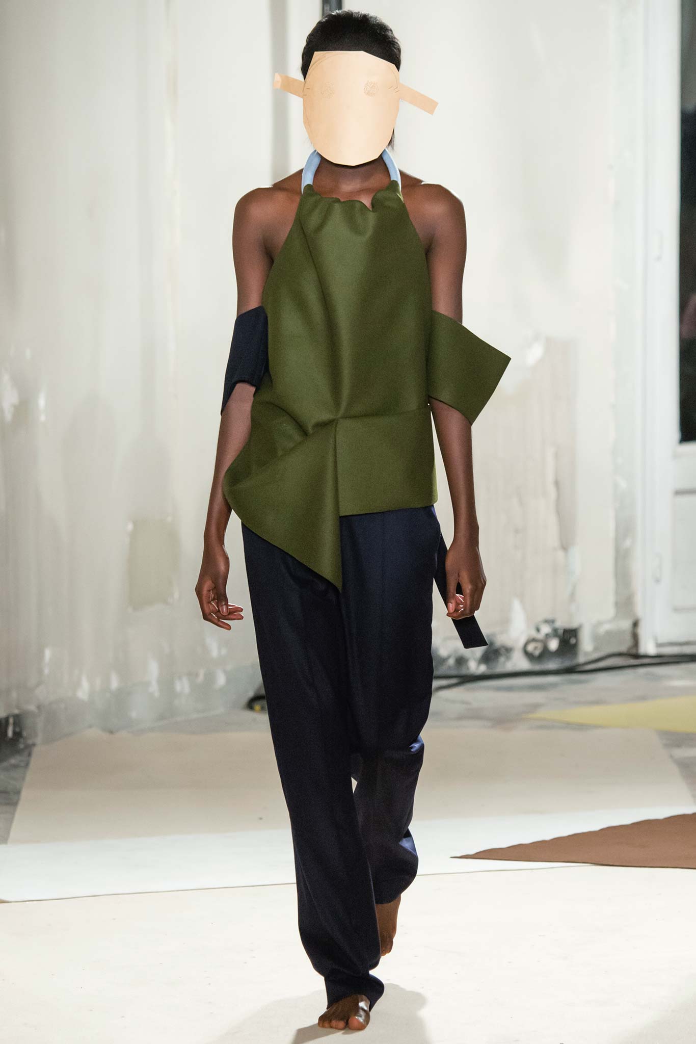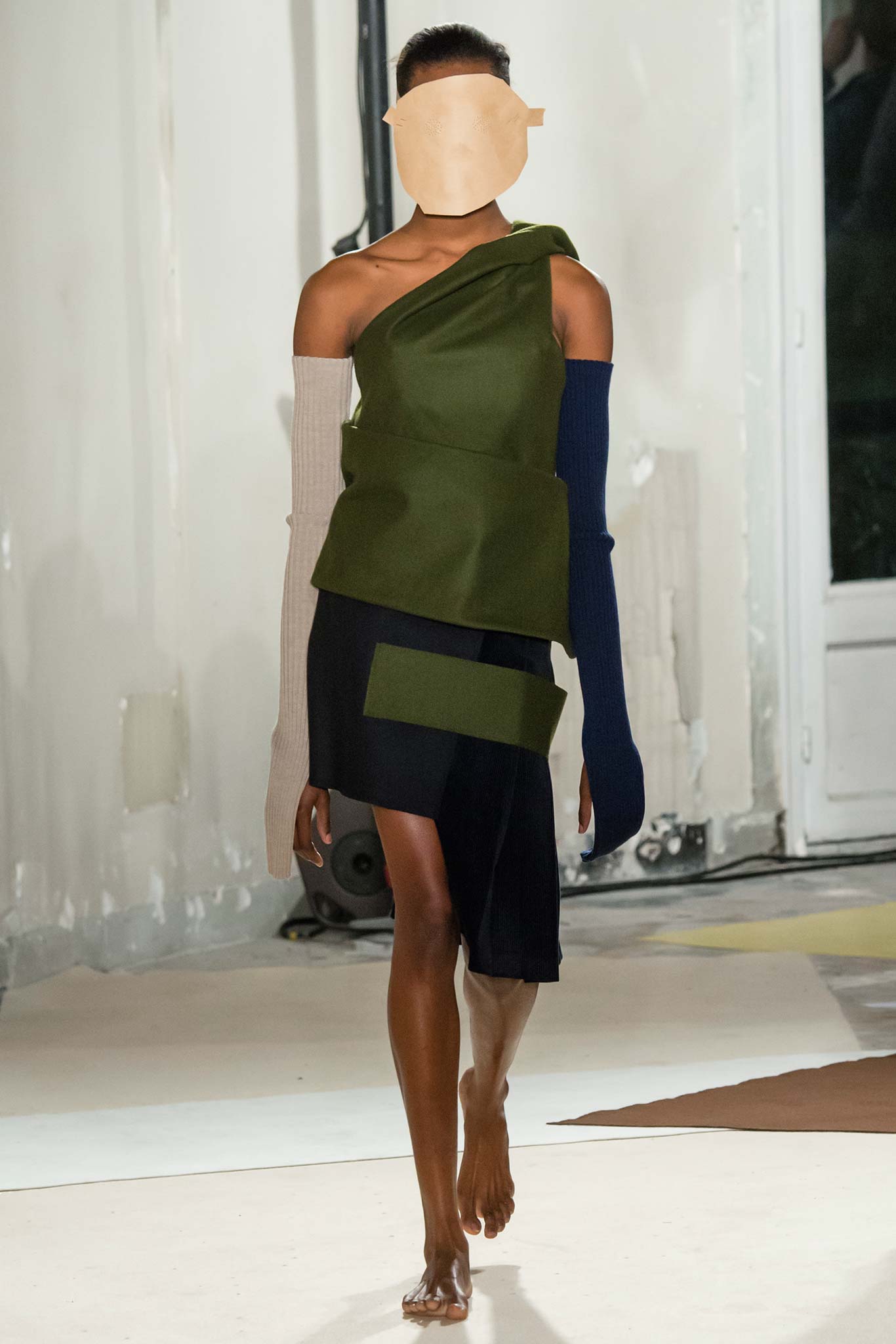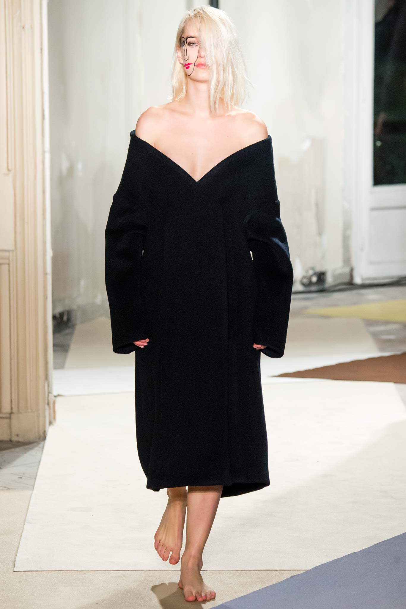 Dadaistic silhouettes. Primitively covered faces. Barefoot. Nudity. Simone Porte Jacquemus continues his “naive” fashion journey, keeping his AW15 the most mature of all. With faces painted by Sebastien Bieniek, which felt very abstract (and creepy), the collection provokes and at the same time shows primitive cuts and simple way of attaching textiles. Explaining that he wanted to capture some of the instinctual feel of being a child, the designer said: “I cut jackets like little kids will do—sometimes the cut is weird, there is just a half top. I like this randomness.” But what does the NSFW dose mean? In my opinion, just like the twirling black hands, it’s a part of some kind conceptual performance which Jacquemus shows off. The whole collection, full of exaggeration and peculiar sex-appeal felt even more artistic and disturbing when you looked at the venue “designed” by Alex de Betak – walls with hole, camping chairs for the guests, dust and a smell of fresh paint. Escapism at its full strength. Although this collection might feel eerie for many, I like it’s elusiveness – it’s magnetising. And, let’s be honest – for a while, we didn’t see any show that was really strange and more than entertaining.