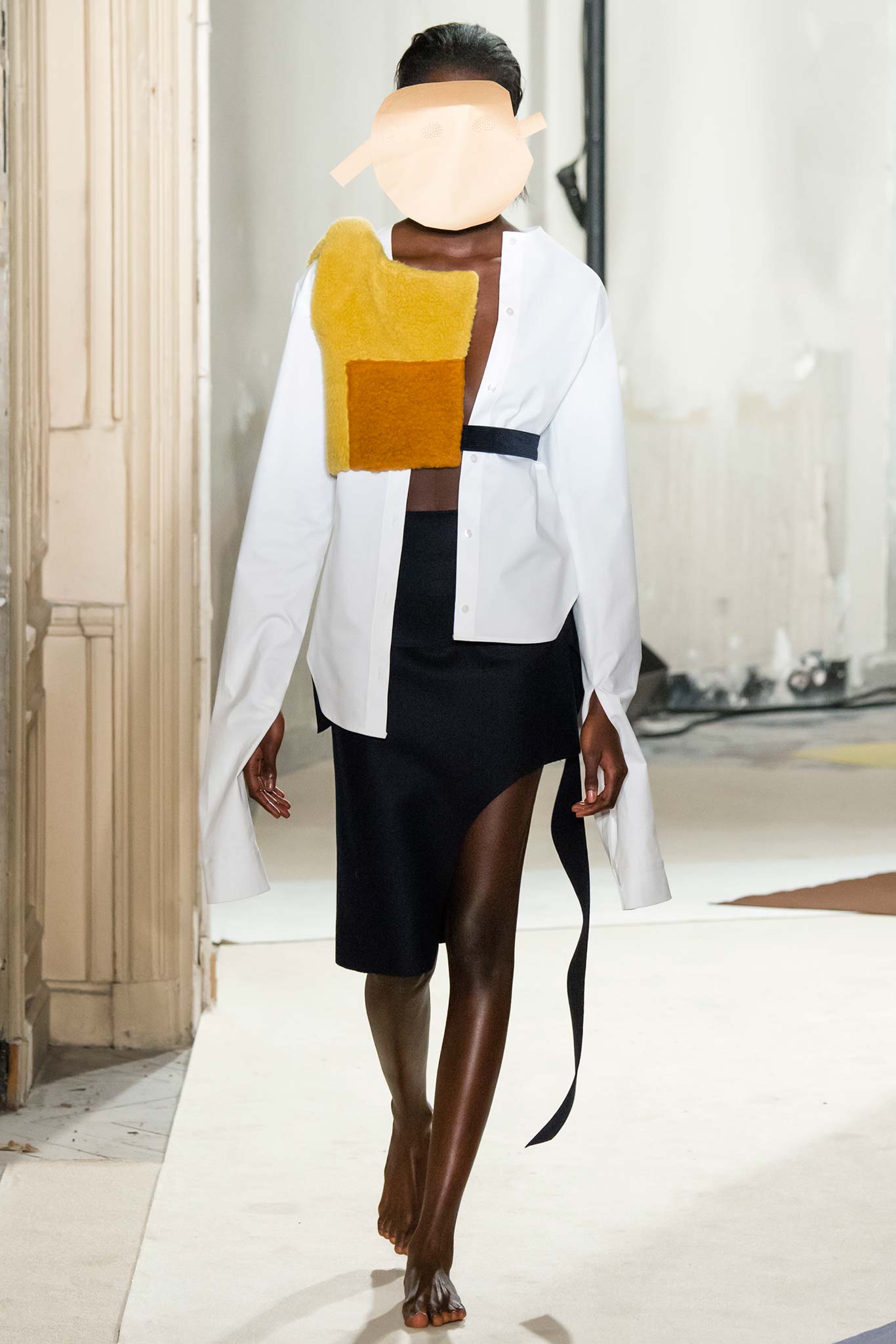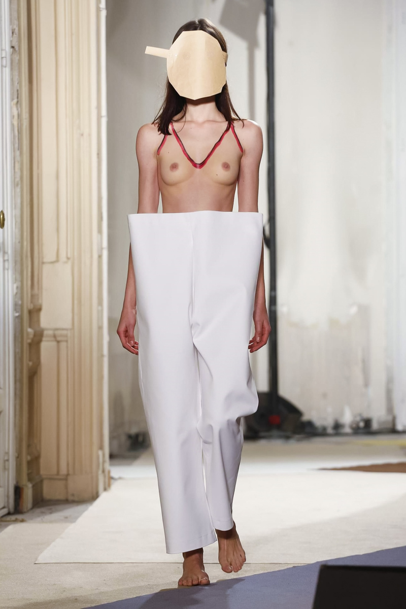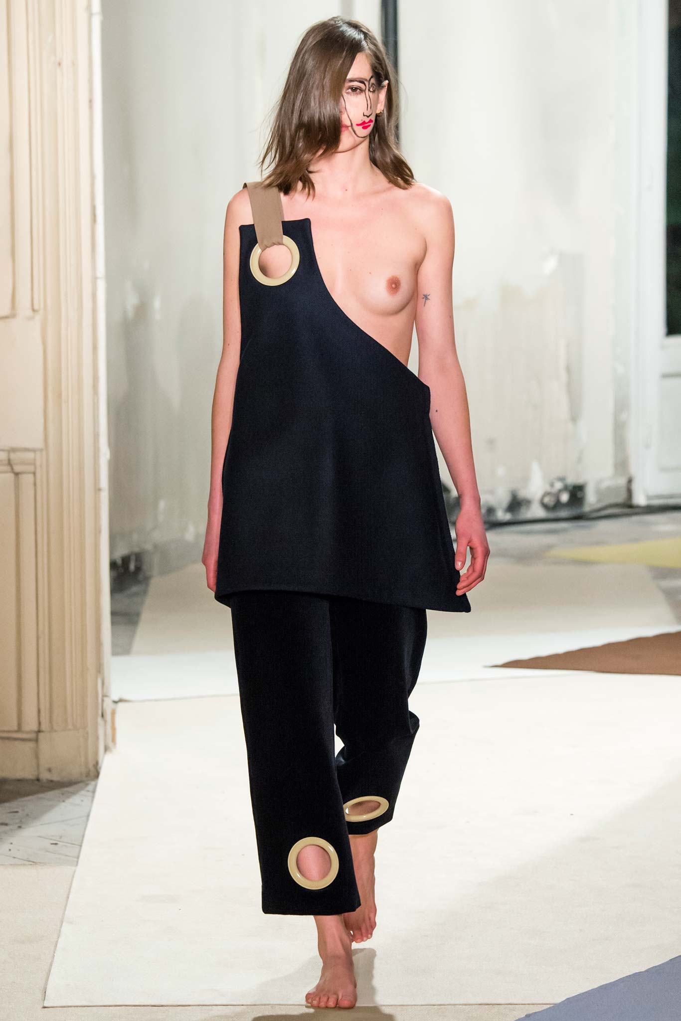 Dadaistic silhouettes. Primitively covered faces. Barefoot. Nudity. Simone Porte Jacquemus continues his “naive” fashion journey, keeping his AW15 the most mature of all. With faces painted by Sebastien Bieniek, which felt very abstract (and creepy), the collection provokes and at the same time shows primitive cuts and simple way of attaching textiles. Explaining that he wanted to capture some of the instinctual feel of being a child, the designer said: “I cut jackets like little kids will do—sometimes the cut is weird, there is just a half top. I like this randomness.” But what does the NSFW dose mean? In my opinion, just like the twirling black hands, it’s a part of some kind conceptual performance which Jacquemus shows off. The whole collection, full of exaggeration and peculiar sex-appeal felt even more artistic and disturbing when you looked at the venue “designed” by Alex de Betak – walls with hole, camping chairs for the guests, dust and a smell of fresh paint. Escapism at its full strength. Although this collection might feel eerie for many, I like it’s elusiveness – it’s magnetising. And, let’s be honest – for a while, we didn’t see any show that was really strange and more than entertaining.