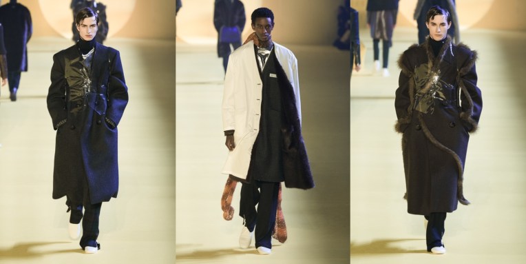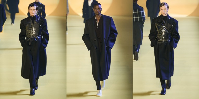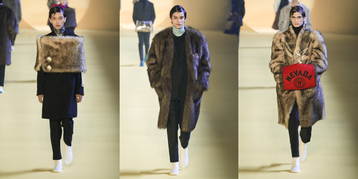 Raf Simons‘ autumn-winter 2020 collection had a transporting, emotional quality, because the character he envisioned appeared to no longer inhabit our world yet they dressed as though they were trying to wear something of the Earth’s past. Departing at Blade Runner and making other narrative stops along the way, this was Simons venturing beyond his obsession with youth. Emerging from a glowing yellow tunnel into a minimalist yellow venue, some models had their hands muffs, a rather anachronistic accessory (be sure that it’s coming back to us next winter!). Positioned front and center, they communicated a crucial piece of information about these people, the “Solar Youth”. If you think this sounds positive, the show notes meant quite the opposite: they don’t want you to know who you are. One theory is that they left the earth as children from our past and awoke as an elite community of our future. This might explain why their attire was at turns elegant, nostalgic, and noir-sci-fi. Silvery high-neck base layers were visible under the impeccable, imposing military-style coats. Sweaters and scarves were juxtaposed with tubular knits that encased the arms. White, red, pistacchio boots (from Simons’ new shoe line, (RUNNER)) a remniscent of a space-suit. Several blazers and collegiate jackets were shielded under clear filmy plastic, creating a refined, corset-like silhouette. The outer-space chic is here.