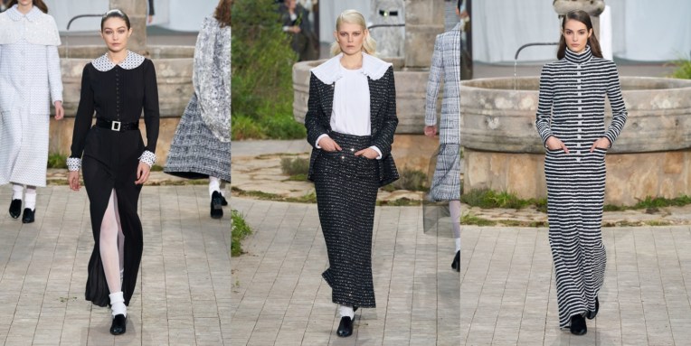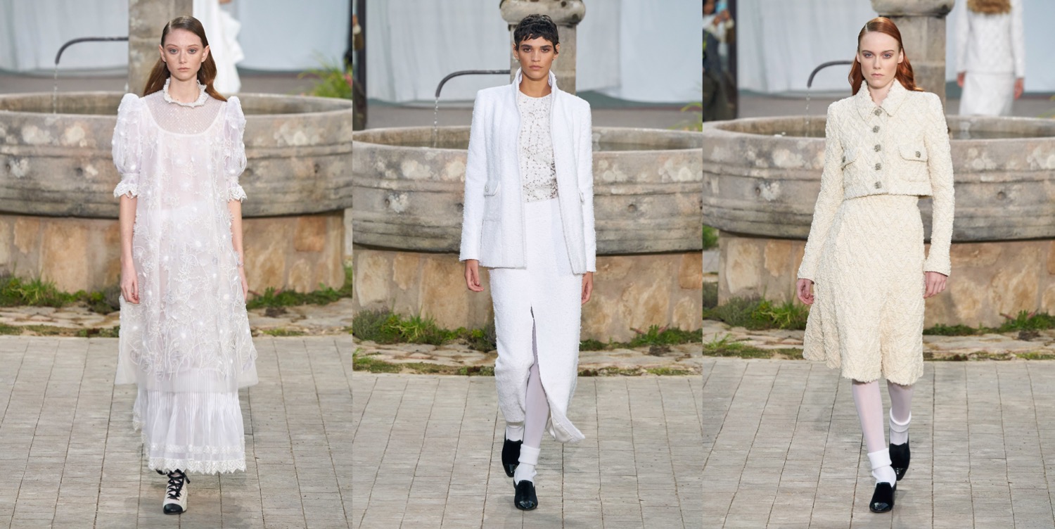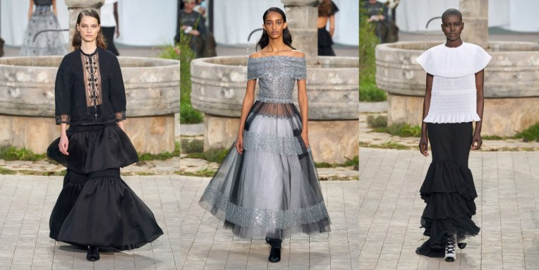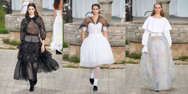Clare Waight Keller’s spring-summer 2020 haute couture collection for Givenchy was rooted in her memories of visiting the garden rooms planted at Sissinghurst Castle by Vita Sackville-West and by reading the passionate love letters between Sackville-West and Virginia Woolf. “It’s one of the most romantic places in England,” Waight Keller said. “I’m quite obsessed by the place.” Famously it was Woolf’s involvement with Sackville-West and dreaming through the Elizabethan history of the Sackville-West family house that inspired Woolf to write her time- and gender-traversing novel Orlando. Coming back to the collection: Waight Keller once again proved her strengths in tailoring. But what truly stunned the audience were the summer-garden colors and swirling 3D-petal forms of dresses. For the designer, it was “my own love letter to Hubert de Givenchy because I went into the archive for this collection and looked into the history of the house from the very beginning.” Photographs of the pristine flower-lace gowns he made in the era he designed for Audrey Hepburn were pinned to her inspiration board. Givenchy, as it happens, was dedicated to garden design too. The outside edges of the jacket of a neat black pantsuit were implanted with a halo of gypsophila embroidery – this one looked incredible. There was a bit of “couture” casual: multilayered tulle petal-pink skirt overlaid with Chantilly lace was worn with a sheer black T-shirt. Waight Keller finished up her show by sending out Kaia Gerber as the ultimate fantasy bride in an off-the-shoulder cut-lace white chemise and umbrella hat that swooped back over the shoulders, amplifying the volume of the entire look.
