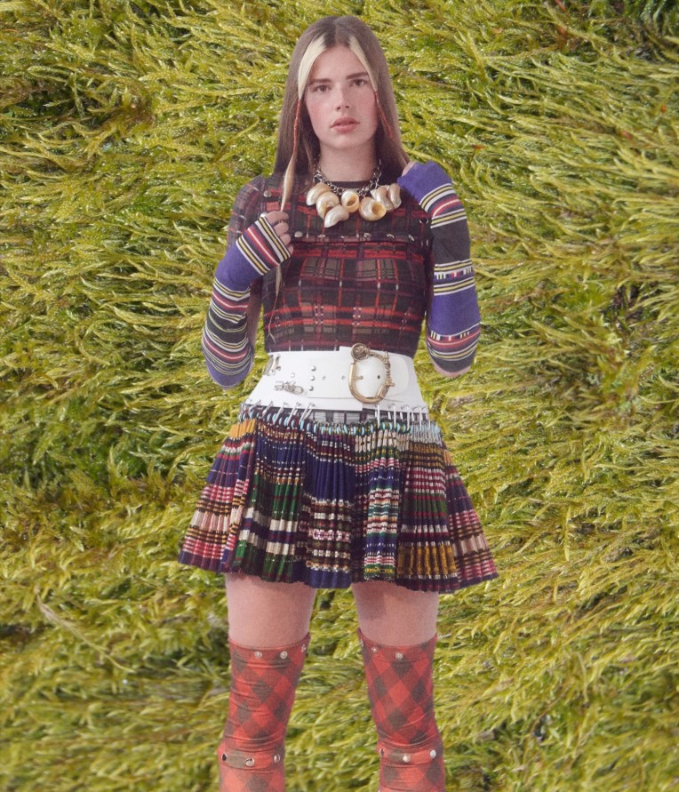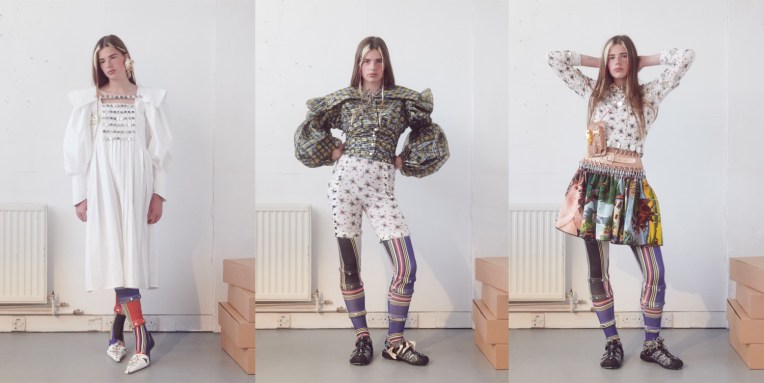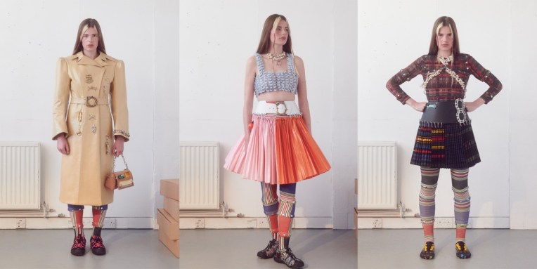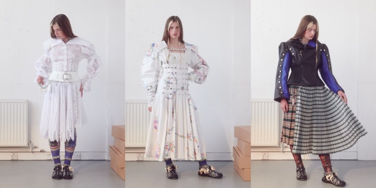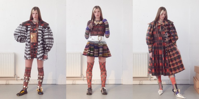 Chopova Lowena is currently one of the most fascinating, emerging labels from London. Emma Chopova and Laura Lowena‘s Central Saint Martins MA graduate collection began with them looking at Bulgaria’s mountain dwellers, particularly the women, and the way they dressed. There, they found all the contrasting elements they felt so intrigued with, like intricate handmade folk costumes worn with secondhand western sneakers and sunglasses. Chopova Lowena is beloved for its juxtapositions, subtly combining modernity and nostalgia, luxury and kitsch, craftsmanship and humour. The same spirit of new and old, rare and mainstream, is reflected in their spring-summer 2020 lookbook. Skin-tight layers of tartan-checks printed mesh are paired with their signature Bulgarian pleats in wool and nylon (they sell out super fast and you’ve surely seen them gracing street style slideshows this fashion month). Big, punk-ish belts double as mini-skirts underneath delicate harnesses made from metal hardware. The folky, peasant dresses and blouses with theatrical sleeves are another highlights. Chopova Lowena has an anthropological approach to design, observing traditional customs and revisiting them through a contemporary lens – often through collaborating with craftsmen in small Eastern European and English communities.