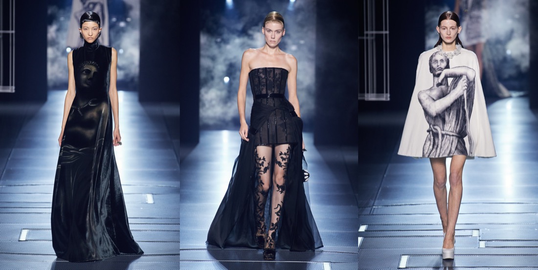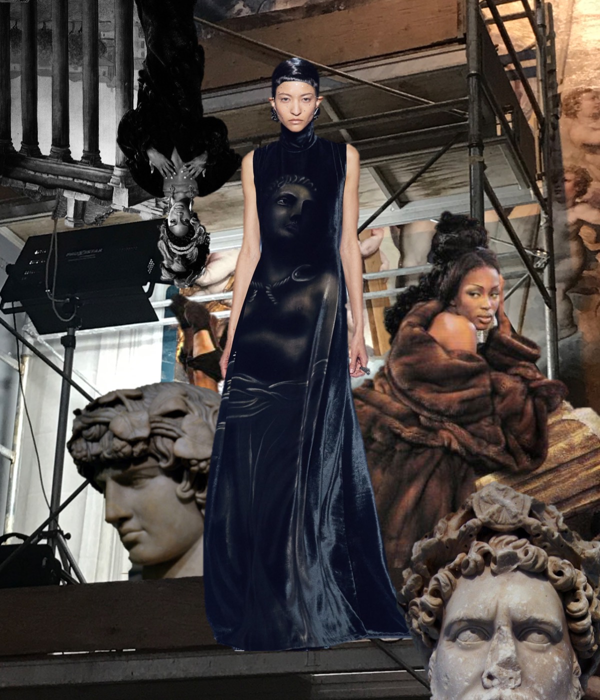 For his third Fendi haute couture collection, Kim Jones clashed the past with the future. This season, Jones continued his evening-centric approach, proposing a series of gowns he said illustrated the craftsmanship and techniques he can’t show in his ready-to-wear for Fendi. Like previous collections, Rome played muse: “It has so many layers to it. It’s such an ancient city,” he said. “We’re always thinking of the past, present, and future of it. The idea of different times and that very spiritual side of Rome, which becomes almost celestial; almost spacey.” Space, astrology, and heaven have been themes in this season’s couture and men’s collections. No doubt mildly inspired by last year’s billionaire space race, they mainly represent the great escape. The pandemic’s part in that scenario is pocket psychology. Jones, who said he had been re-reading Dune and a book on Star Wars by George Lucas, approached the theme with a Hollywood zest that recalled a number of sci-fi films centered around the age-old conversation between the ancient and the futuristic. Mirroring that dialogue in the time-transcendence embodied by Rome, Jones mixed the city’s structures with futuristic imagery and applied it to eveningwear. Renditions of the statues outside Fendi’s monumental Palazzo della Civiltà Italiana headquarters hand-painted on velvet dresses and a sheared mink cape looked like the statues in Prometheus or the landscapes in the scenes in The Planet of the Apes. Elsewhere, he applied the contours of a Roman fountain to a white dress and “filled it with mink,” while the radiant opening and closing dresses seemed to morph the lines of the peplos – the oldest dress in history – with a sci-fi structure. The collection was Jones’s first haute couture show for Fendi with a live audience. As a showcase of the skill of the house’s Roman atelier and a theater of ballroom fashion, it was a proper ending to a marvelous couture season.