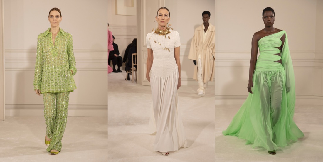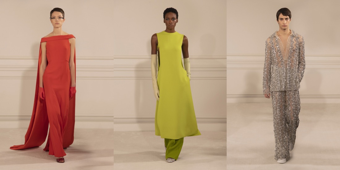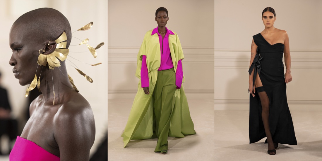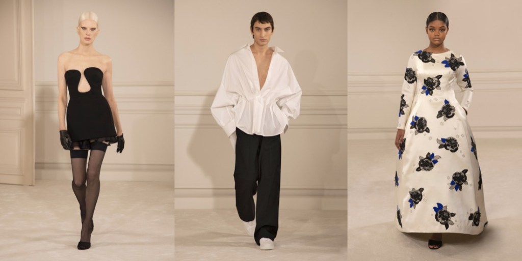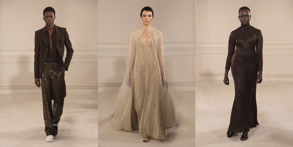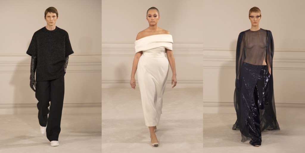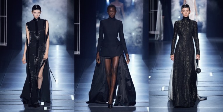 His consistent cast helped to illustrate the power of the craft. The intertwined straps of an ebony velvet gown framed the shoulders of the model and pulled in her waist, the volume of its skirt balancing out the proportions. A chocolate stretch tulle dress covered in two kilos of Venetian glass beads hand-embroidered for three months hugged the body, allowing the beads to shape and support the model’s frame. Piccioli employed his approach to surface decoration, too. A lilac faille gown was adorned with great big bows around the neckline, something that could easily look overwhelming on a fuller figure, but didn’t because of the custom proportions and placements of those bows on that particular neckline. In his couture take on the stretchy body-con favored by the generation who coined slim thicc, Piccioli proposed a neon coral ankle dress, which wasn’t stretch at all, but created through four layers of georgette whose interaction created a natural elasticity that adapted to the body. Throughout, he demonstrated how couture can build a silhouette around the body, and either highlight a person’s shape or manipulate it through dressmaking. It made all the difference, because clothes are construction. One size doesn’t fit all, but one blueprint scaled up or down certainly doesn’t, either. We’ve all seen that in practice on red carpets where people of a different physique to the body that modeled the dress on the runway can end up looking under – or overblown, because the dimensions and adornments of the silhouette don’t take kindly to the scaling process. And then, the confidence goes. “I feel that if you don’t deliver the ideas of power and strength and fierceness with these kinds of shapes, you’re missing the message,” Piccioli said. If body empowerment is something he is sensitive to, it’s also because his own three children are in their teens and twenties: Gen Z-ers raised on social media in an age where body ideals have the added extremity of plastic surgery normalization. “That’s what I share with them,” he said, referring to the connection he felt with his cast through the experiences of being a father to young people today. “This could deliver a strong message for young people who are struggling with something. If she’s beautiful, you can be beautiful,” Piccioli said, gesturing at one of his gorgeous cast members.