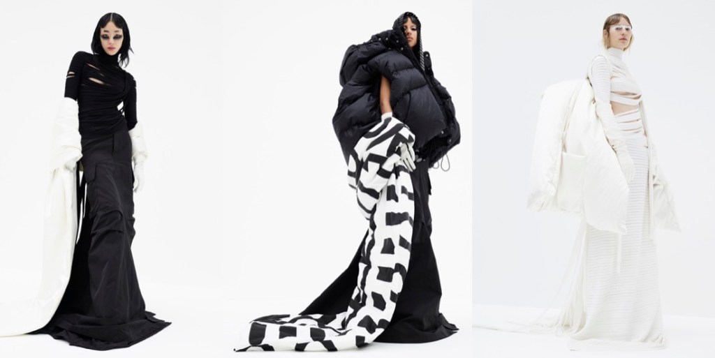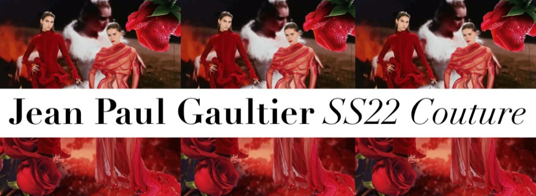 That marinière dress was sandwiched between a series of corseted jacquard knit looks, whose body molding striations recall ’90s Gaultier and plenty of gorgeous, ethereal evening dresses, confections of chiffon selvedge, whose lightness were amplified by the ferocious ingenuity of their barely visible inner constructions. One, in black chiffon across a delicately pale pink corset, was a particular knockout. The interaction between the two visions continued with an evening gown in a boudoir-y, peignoir-y ’30s peach which looked like a deconstructed corset, the lacing asymmetrically blown up across the billowing skirts, while a cream knit sweater dress featured cable panels that intersected, baring a little skin along the way. Elsewhere, those wired experimental volumes Martens loves so much figured prominently, in red velvet or green taffeta, as did a wink-wink to Y/Project with the Y shaping of the hips on some of his silhouettes, his own version of the classic hourglass but reimagined for today. Martens was drafted in to do this collection two years ago, so because of the pandemic, it has been in gestation for a while. Yet, despite that, it feels hardwired to the moment. While it will very likely appeal to Gaultier couture loyalists, it will also speak to today’s fashion-savvy IG generation who applaud every big gesture and historically savvy flourish.