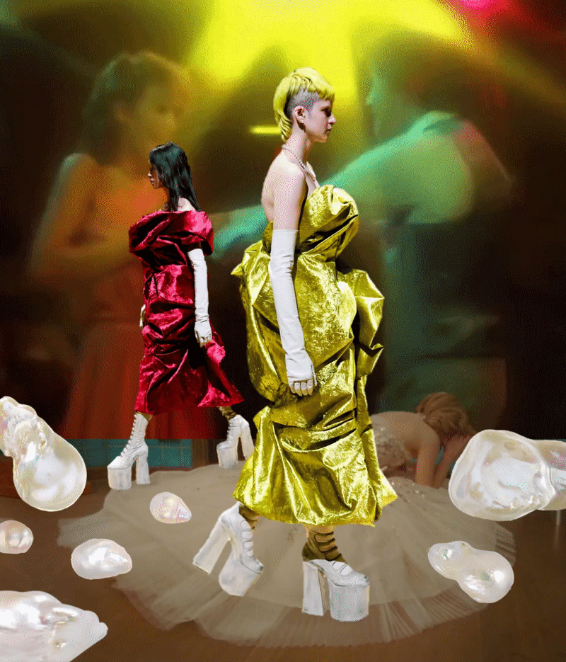 Lately, Area becomes more and more experimental, transforming its “occasion-wear” into something conceptual, even metaphysical (through a slightly ironical, tongue-in-cheek lens). The noise of flies buzzed through speakers as the guests waited for the spring-summer 2023 show to start. The invitation came in the shape of two, fake squishy bananas. “This season is all about fruits,” Piotrek Panszczyk said before the show at his studio in Chinatown. “The beauty of them, but also the symbolic meaning of them. In a way you can think of fruit as something fresh, a new start, but when it starts decaying, it becomes about mortality.” And so the show opened with sculptural banana looks: a cropped top and a skirt made of oversized banana sculptures, followed by a jacket with banana sculptures surrounding the bodice, followed by a strapless denim mini dress, all in tie-dye shades of pink, purple, and white which were meant to mimic the colors of bruised, rotten fruit. The next dress was made of small, individually draped and formed banana shapes that were joined together in the style of a bandage-dress, hugging the body and leaving nothing to the imagination. While there were many sculptural pieces on the runway, it was indeed in the softness that Panszczyk found the most success.“This season there’s way more fluidity, we’re all about construction. We really started lightening it up, using laces, and fluid fabrics. Example: the red strapless empire waist flocked tulle gown with black lurex whose pattern brought to mind squashed grapes when wine is being made. Another highlight of the show was its diverse cast, which featured a few older models as well as a few “curvier” models, the latter wearing tailored gowns which hugged their bodies in the right places. “Aging also comes with beauty,” Panszczyk explained. “And I think for us it’s always important to showcase these different stages of life.” He added, “for us, it’s really about balancing these ideas, like how can it be about really, truly fantasy? And how can you evoke this kind of energy in real life?”